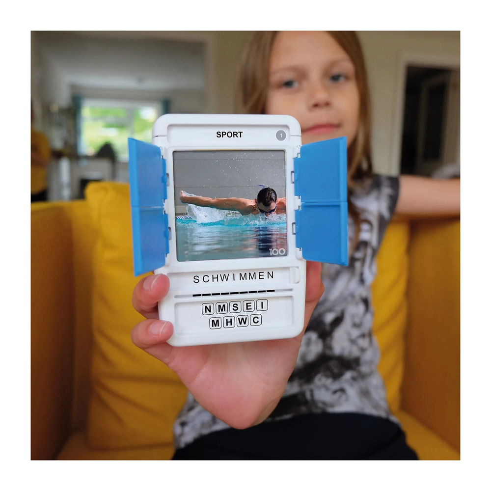 Do you know your way around the world of sport? 100 sports are waiting for you to guess. Is the letter combination enough or do you need one or more picture sections? Can you guess all 100 sports? 100 PICS is the clever combination of word and picture puzzles, packed in the unique quiz box. The players have to guess 100 picture cards using only letter combinations or hidden picture information. The integrated slider gradually reveals the solution. The ingenious quiz box with four hinged windows is compact, practical and offers many game options.
