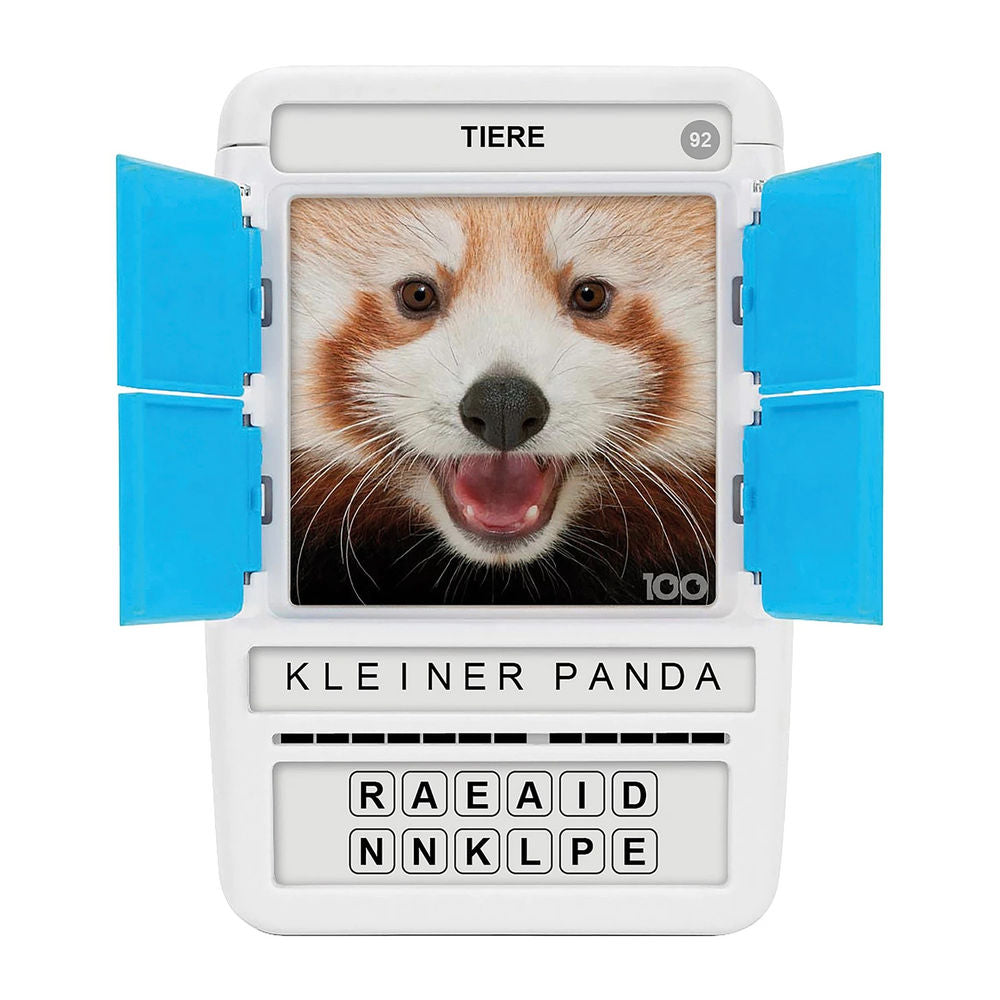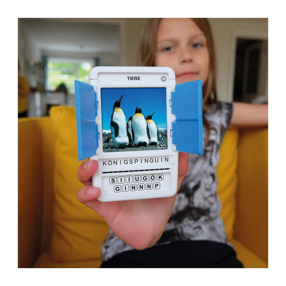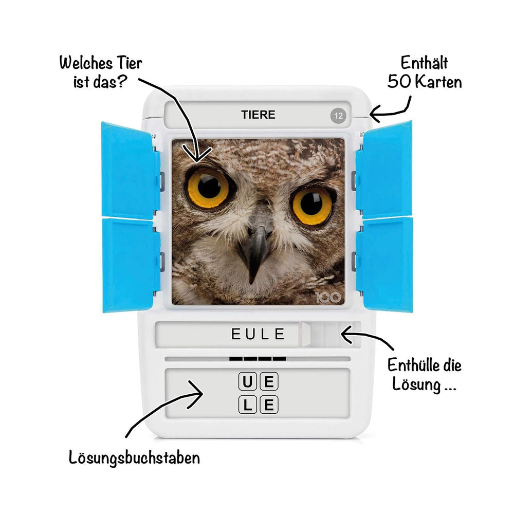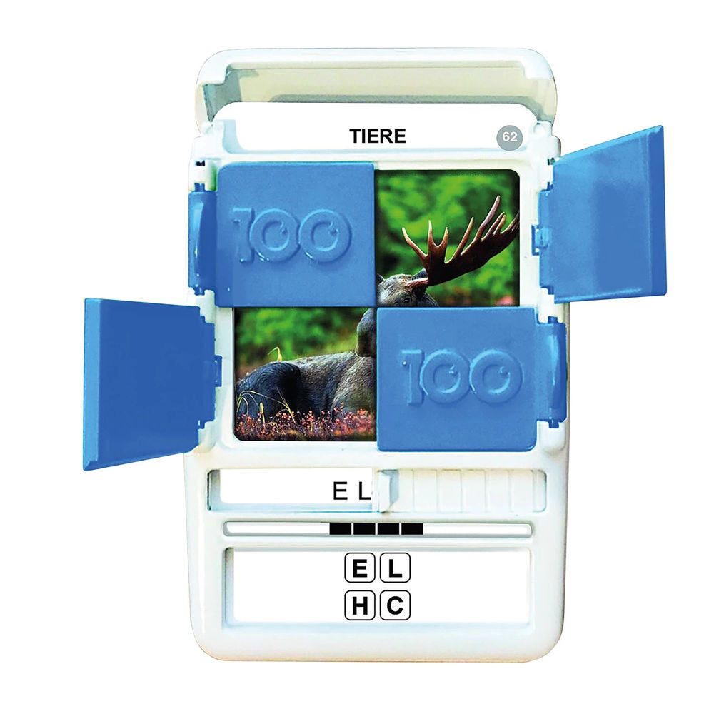 Do you know your way around the animal world? 100 animals from all species are waiting to be guessed by you. Is the letter combination enough or do you need one or more picture sections? Can you guess all 100 animals? 100 PICS is the clever combination of word and picture puzzles, packed in the unique quiz box. The players have to guess 100 picture cards using only letter combinations or with hidden picture information. The integrated slider gradually reveals the solution. The ingenious quiz box with four hinged windows is compact, practical and offers many game options.