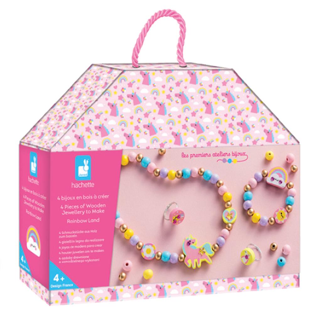 Kreiere dein eigenes Schmuckset aus Holz! Mit diesem Set können 1 Kette, 1 Armband und 2 Ringe aus Rainbow Land, dem schönen Reich der Einhörner und Regenbogen, mit umfassenden Material gestaltet werden: 2 bedruckte Figur-Holzperlen, 3 bedruckte runde Holzperlen, 33 bunte Holzperlen, 22 Goldperlen, 2 bedruckte Holzflachperlen, 1 Bogen mit 8 Strasssteinen, 1 Gummiband und 1 Heft mit Anleitungen und Vorlagen. Die Box verwandelt sich in eine niedliche Handtasche, in der du all deinen Schmuck und andere kleine Geheimnisse aufbewahren kannst. Diese Aktivität fördert die Entwicklung der Kreativität und Motorik und ist für Kinder ab 4 Jahren geeignet.