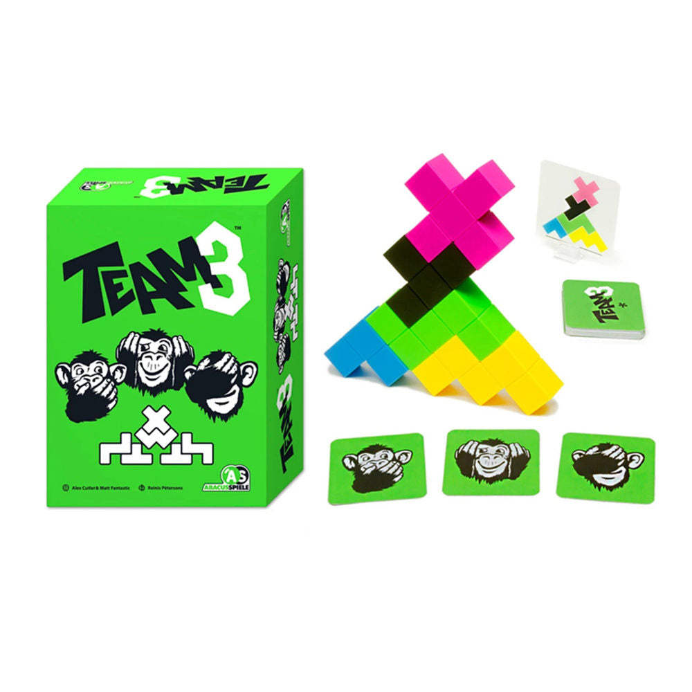 Say nothing, hear nothing, see nothing. (based on a Japanese proverb) In TEAM3, a team of 3 players must build a building together. But how is that supposed to work if: the architect, who knows the building plan, is not allowed to say anything; the construction manager, who is supposed to describe what needs to be done, only sees an architect gesticulating wildly, and the construction worker, who is ultimately supposed to build the building, cannot see anything at all? The answer: with teamwork, chaos, and lots of fun!