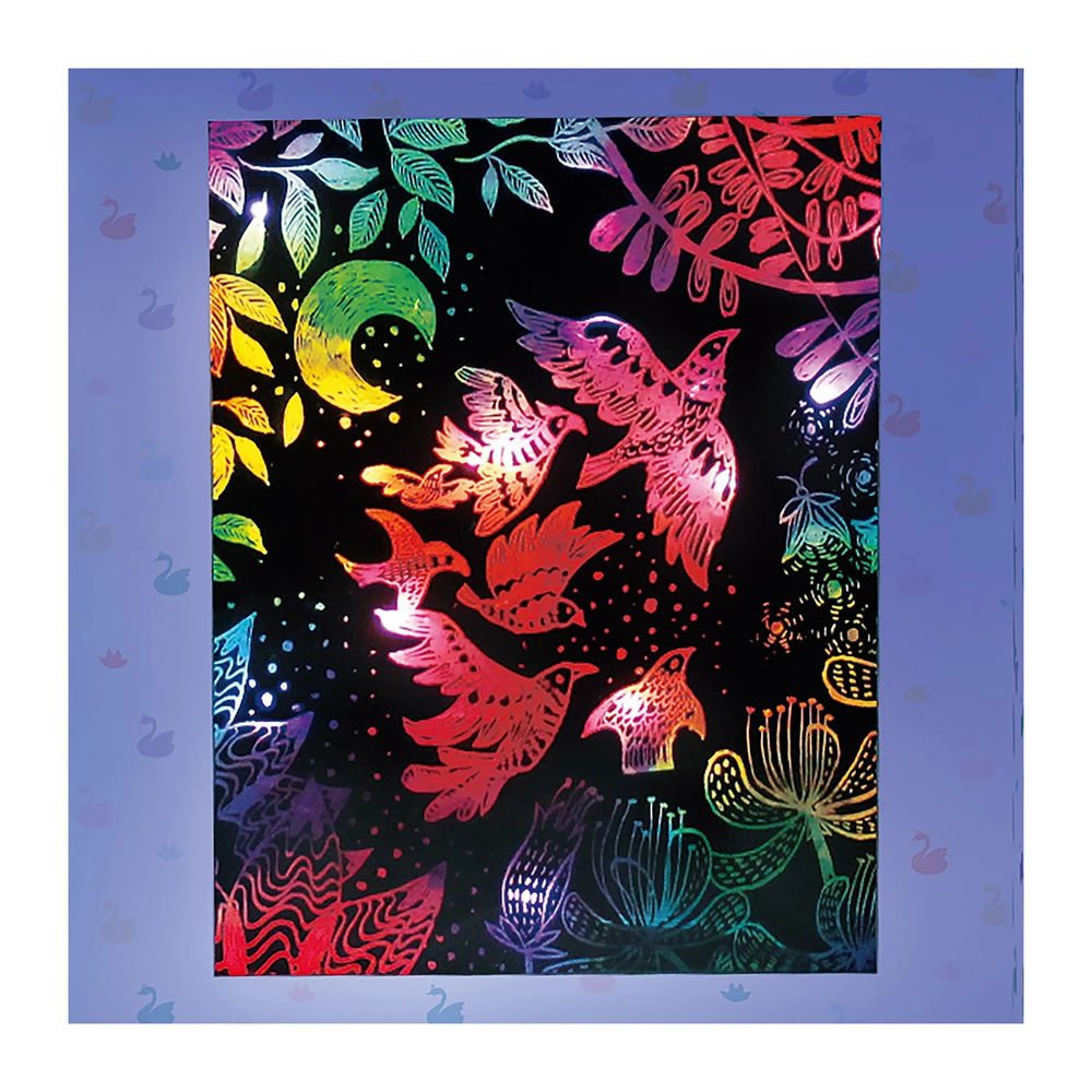 Decorative scratch pictures in a magical light box. Contents: 8 scratch pictures, 2 wooden pencils, light box, instructions and accessories. Requires 2 AA batteries (not included).