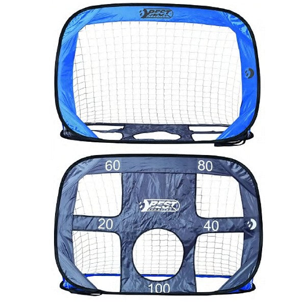 Pop up goal with goal wall - goal frame made of foldable steel wire 1.75 mm x 5 mm goal frame reinforcement fiberglass Ø 6.9 mm Dimensions: 120 x 80 x 80 cm Color: Blue Weight: 1 kg Incl. goal net with carrying bag and 4 pegs.