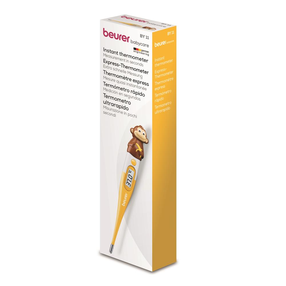The Express Thermometer BY 11 Monkey with the cheerful monkey figure measures the temperature extra quickly in just about 10 seconds. The end of the measurement is signaled with a beep. If the measurement results are above 37.8°C, a warning tone sounds, the fever alarm. The thermometer also guarantees proven reliability thanks to the flexible measuring tip. The thermometer is waterproof and can be disinfected. It switches off automatically after use.