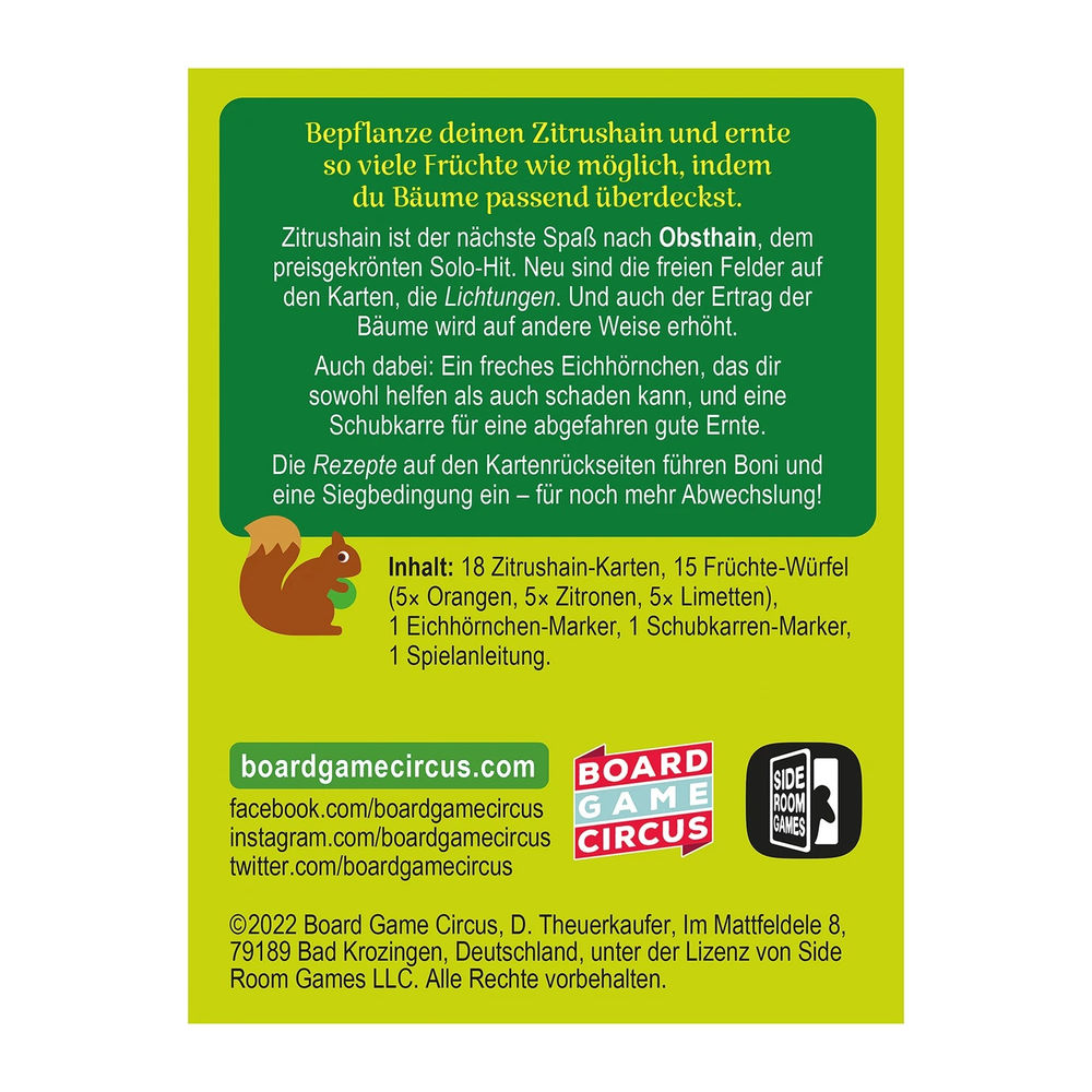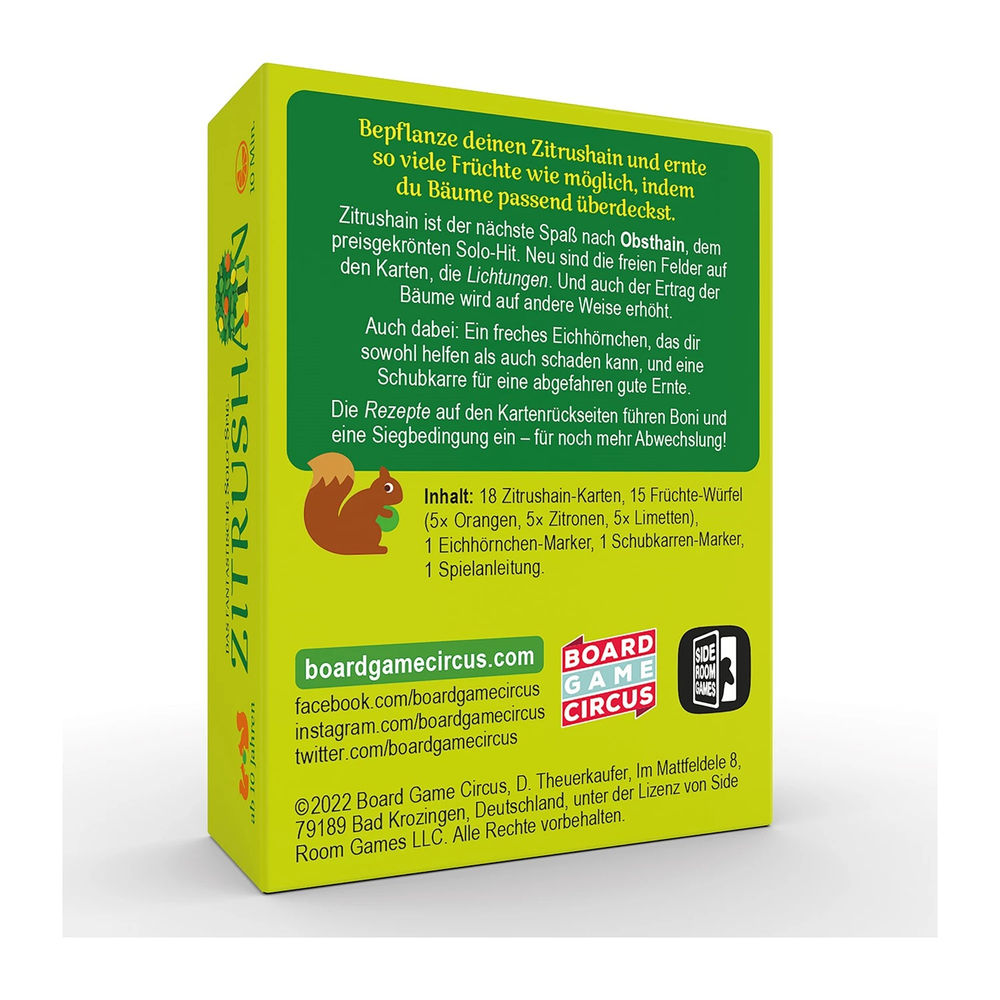 Citrus Grove is the next fun game after Fruit Grove, the award-winning solo hit. In this fast-paced solo puzzle, you want to harvest as many fruits as possible by cleverly placing your hand cards. To do this, place your cards so that the fruit trees shown on them cover other trees of the same variety in your citrus grove. The better you do this, the more fruit - and therefore points you will harvest. Like Fruit Grove, Citrus Grove also contains rules for playing with more people. For this, you will need additional copies of the game. In this variant, you all play with the same cards and can compete against each other.