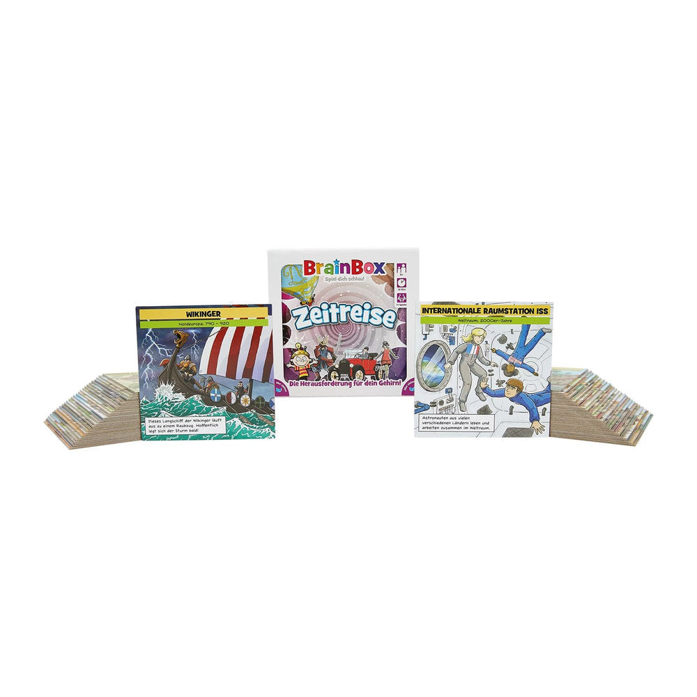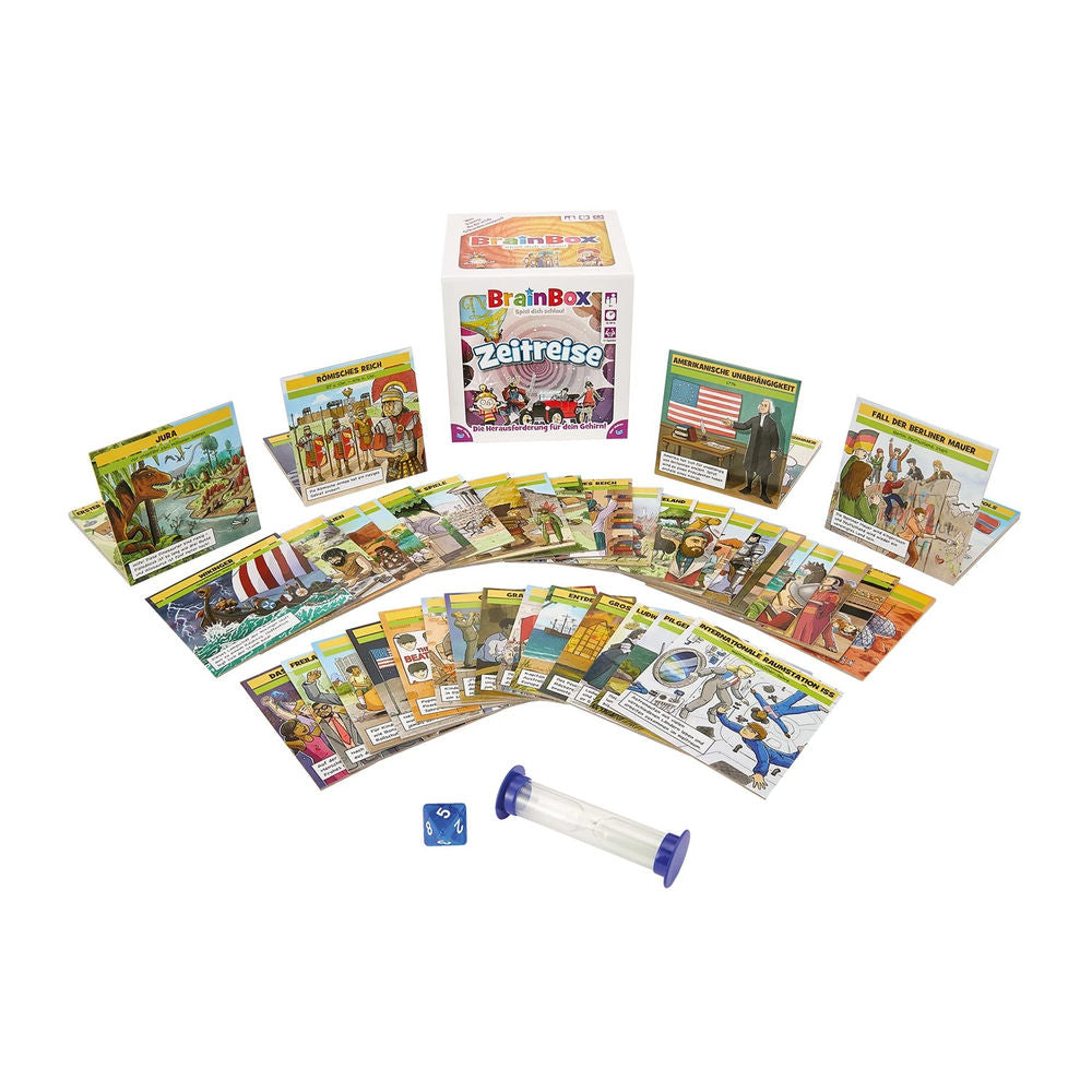Each card shows pictures from dinosaurs to the discovery of Australia, from the Stone Age to the fall of the Berlin Wall and from the Aztec Empire to the first flight in an airplane. On the back of each card there are eight questions about the topic on the front. The BrainBox encourages children's observation and memory skills in a playful way.