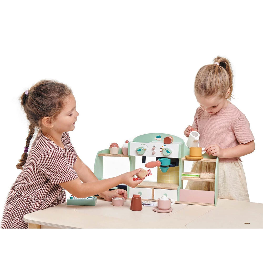 5 different colored coffee capsules, 2 clattering regulators, milk jug and frother, 2 cups, 2 plates, 1 pot holder, knife, fork, spoon, sugar cube and chocolate shaker, 2 coffee pods and 3 different toppings, 3 different tea bags wrapped in fabric, 1 sandwich, 2 panini, 3 pastries and 2 cupcakes and a panini toaster.