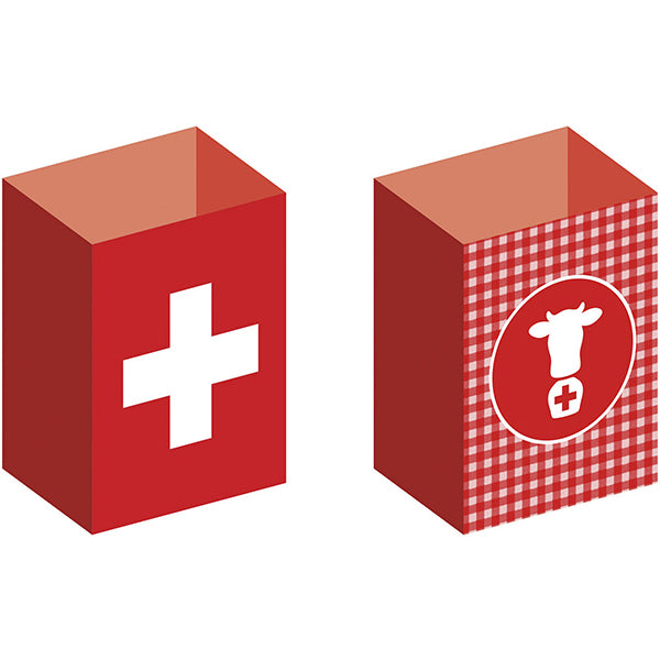 Red light bags with CH cross, delivered in assorted sets of 3, 2x with cross motif and 1x with cow motif. Can be used as decoration for your August 1st celebration.
