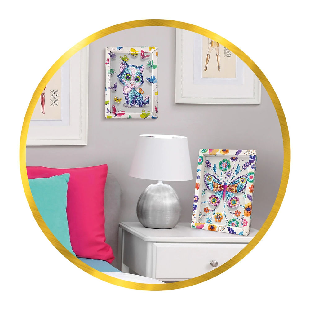 Create a beautiful picture with sequins. The picture of a cat is on a Styrofoam plate, which serves as a base for attachment. Small needles are included. Includes a display case for storing the various sequins. Thanks to the frame, the finished picture can be easily set up and hung on the wall.