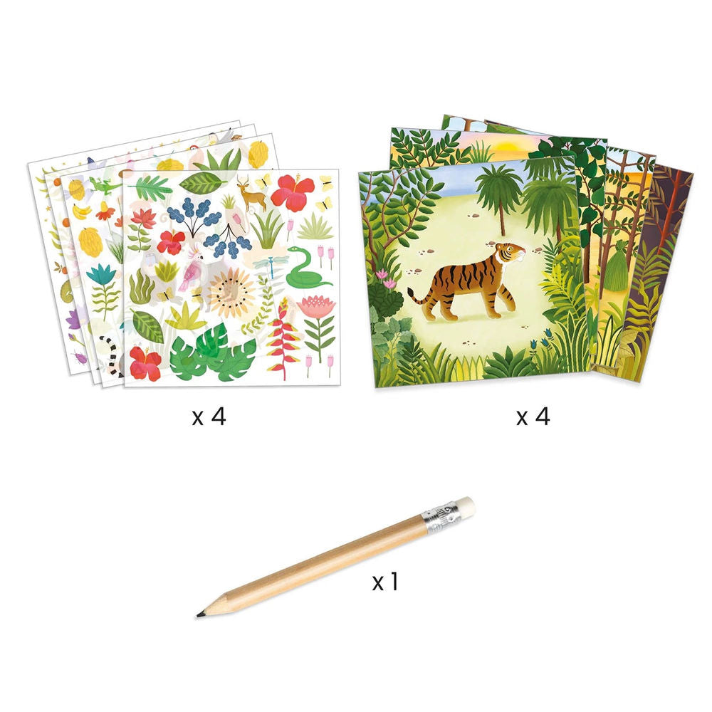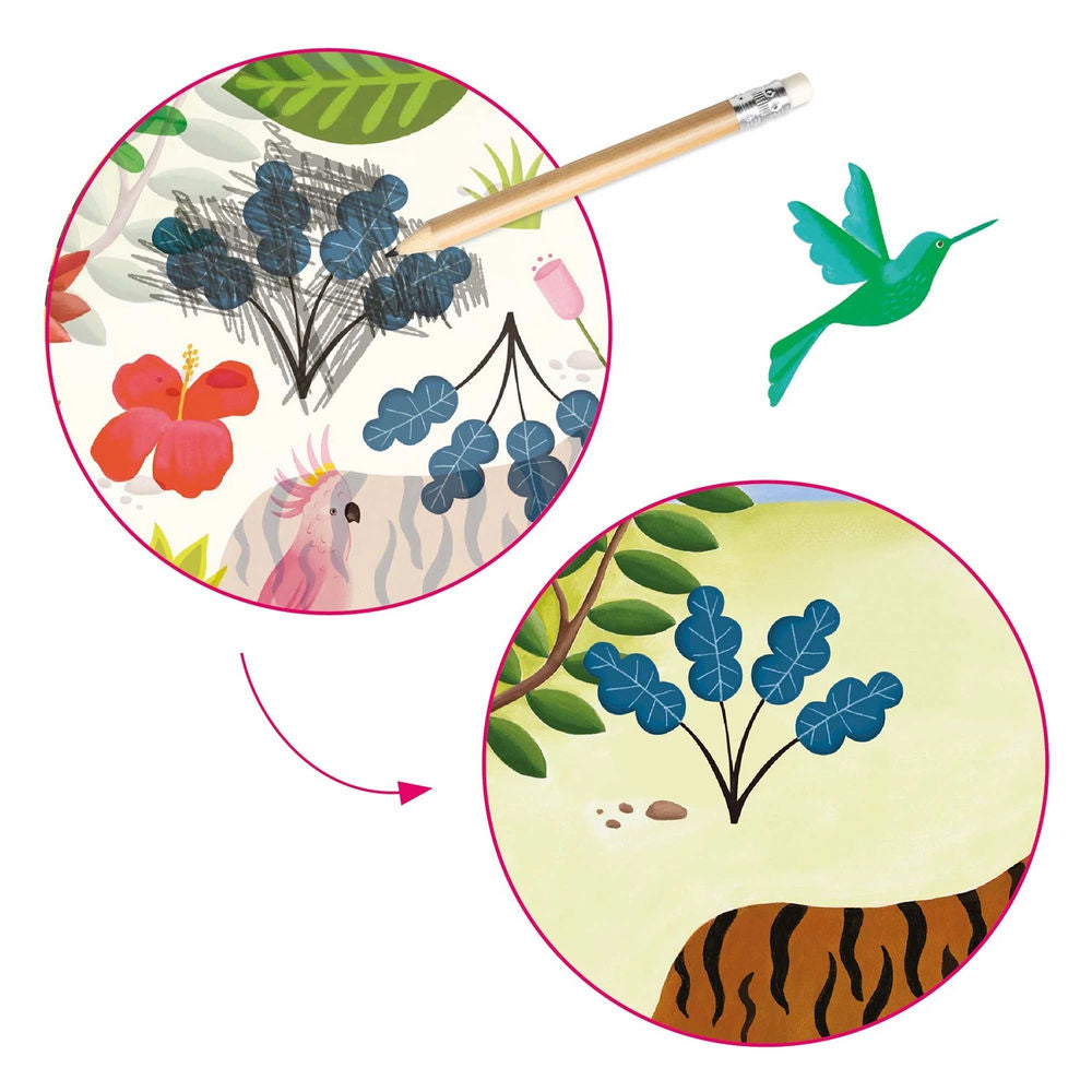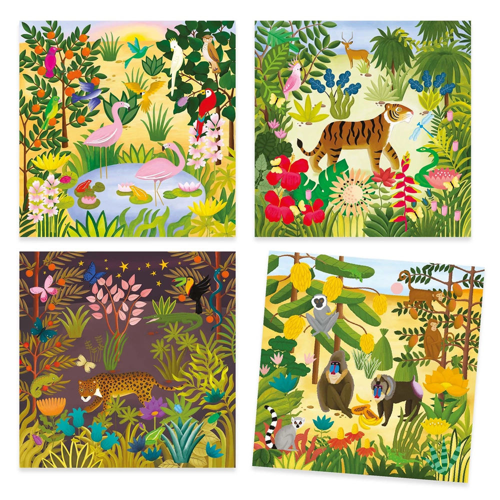 A transfer activity that invites you to discover the style of the famous Henri Rousseau (the "customs officer Rousseau"), a great master of naive art. Little by little, the images are added and placed one on top of the other to create 4 images depicting wild animals hidden in a lush natural setting!