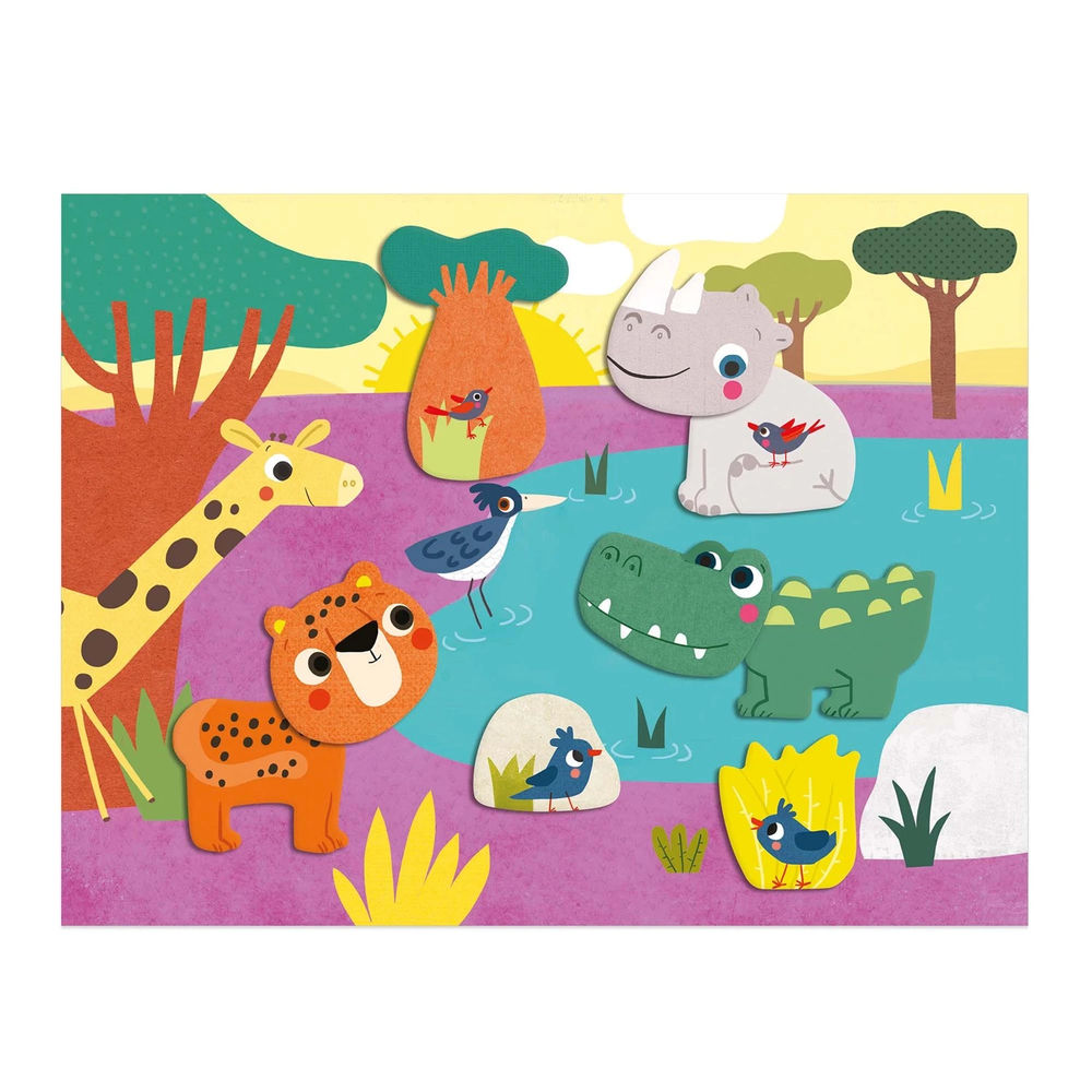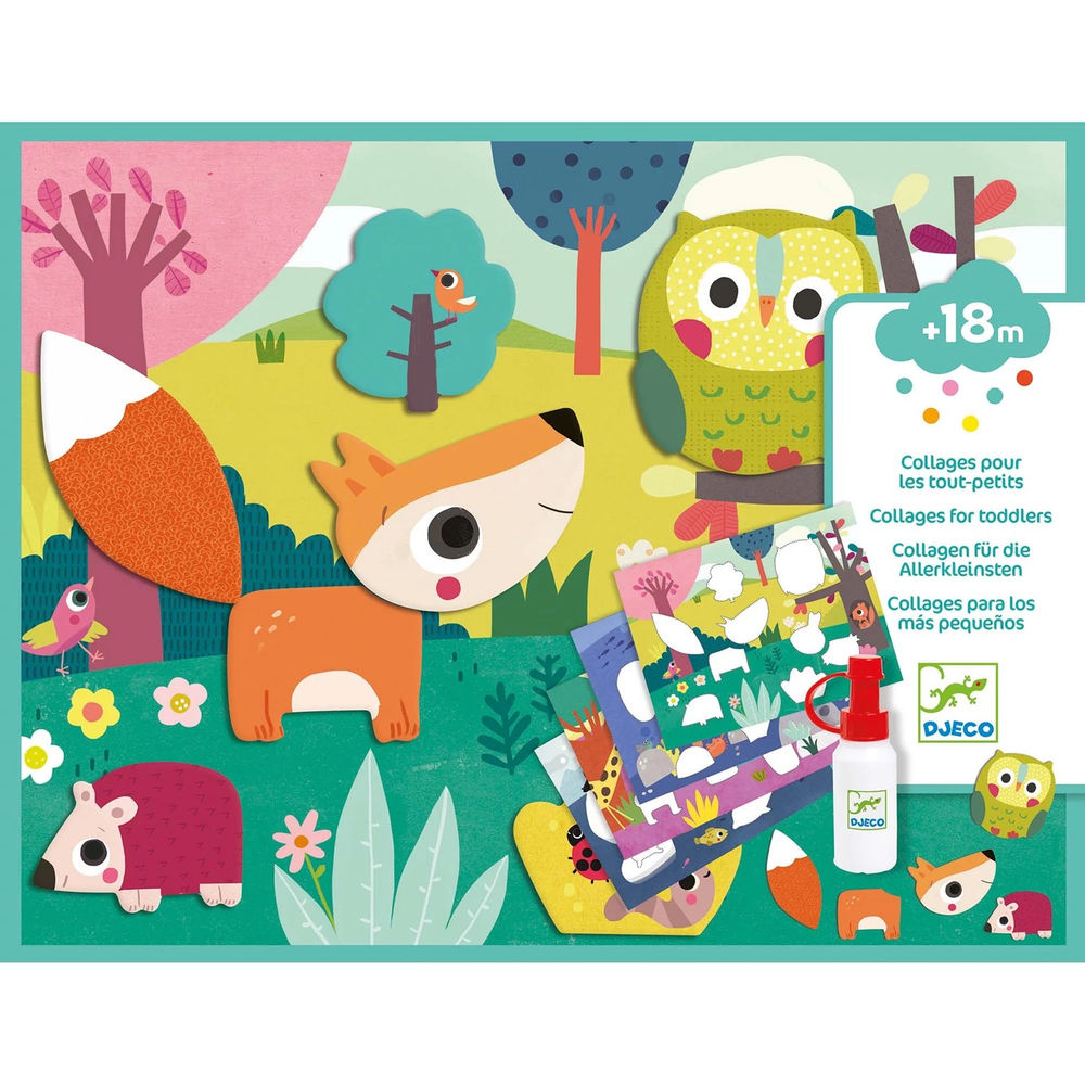 A first collage set for the very youngest children aged 18 months and over. Thick shapes that can be easily removed to stick them on pretty illustrations and create 4 pictures.