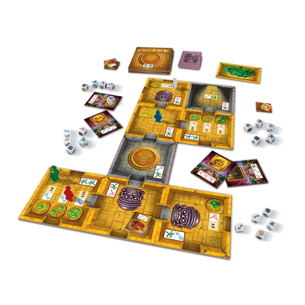 Ihr seid ein Team von Abenteurern – eingeschlossen in einem verfluchten Tempel. Gemeinsam müsst ihr die magischen Steine in den Tempelkammern aktivieren, um den Fluch zu bannen. Sprecht euch ab und helft euch gegenseitig, denn manche Aufgaben könnt ihr nur gemeinsam bewältigen. 10 Minuten bleiben euch bevor der Temple einstürzt! Escape ist ein kooperatives Echtzeitspiel, das nicht in Spielrunden gespielt wird. Stattdessen würfelt jeder so schnell er kann und so oft wie möglich mit seinen 5 Würfeln.