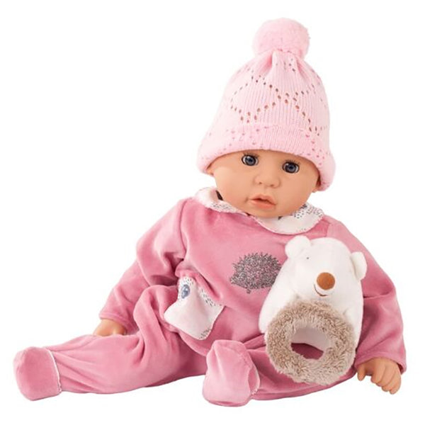 Götz doll Cookie, 48 cm with sleeping eyes, dressed in a cute romper and hat. Also comes with a bottle and a soft toy. This doll is a real playmate. Her soft fabric body is filled with fluffy cotton wool and fine granules. The clothing is easy for children to take off and put back on. Includes pacifier.