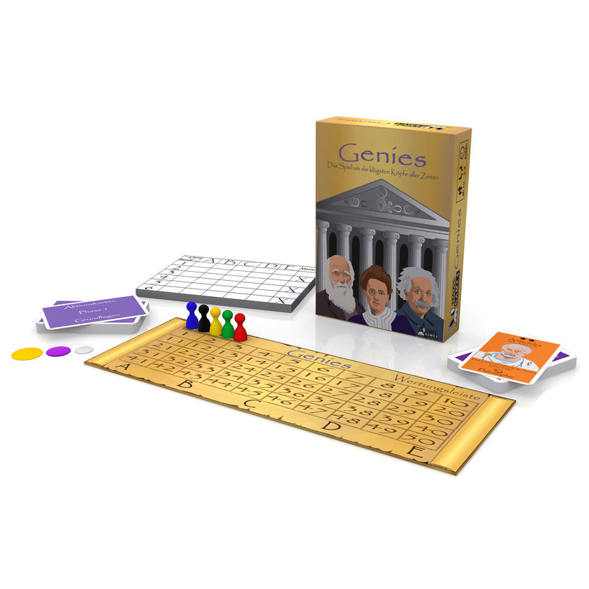 "Genies" is a bidding game for two to five people aged ten and over. In six rounds, players secretly bid on five different geniuses each. Only after all players have submitted their bids are the bids compared and the highest bidder wins, provided they still have enough resources.