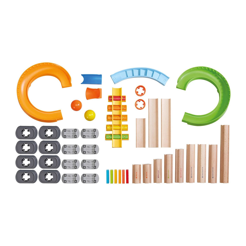 Different heights for maximum momentum. Steep ball curves for extra-high ball speed. Sound staircase brings music into the Kullerbü game. Maximum flexibility: Elements can be combined with other Kullerbü tracks. Sound staircase can also be driven on by vehicles.