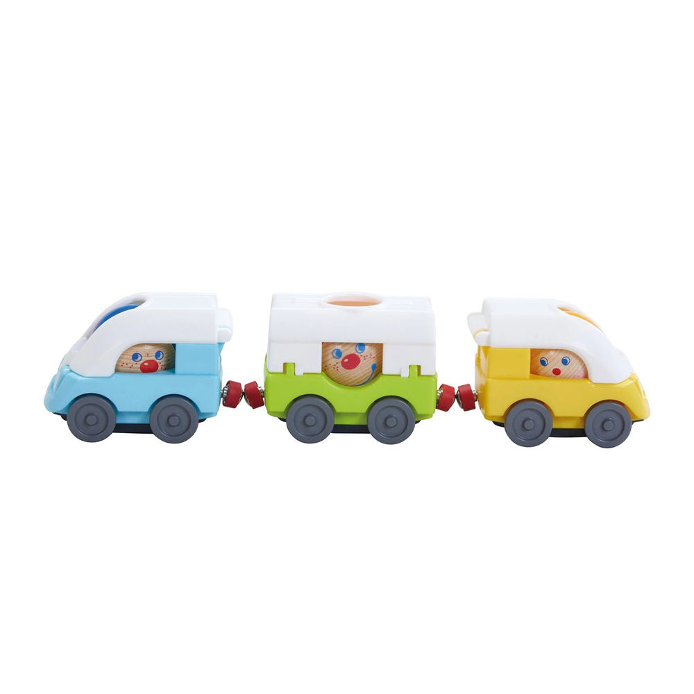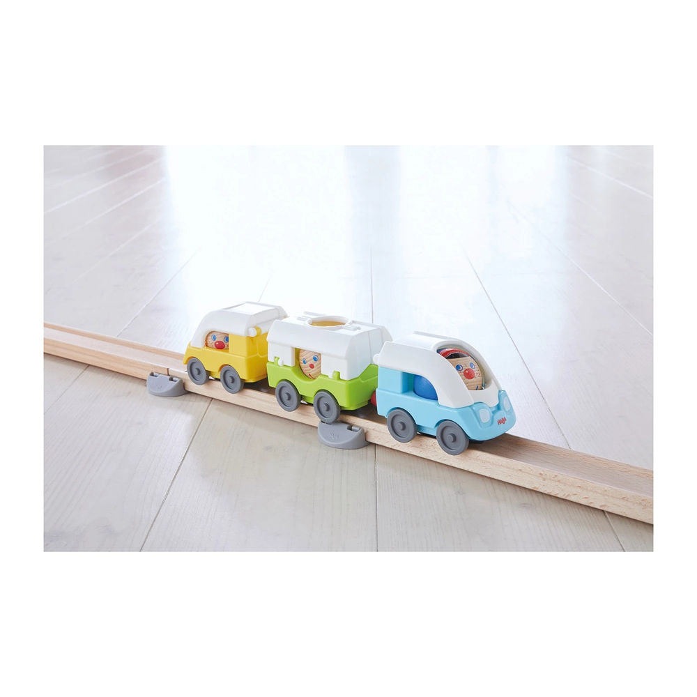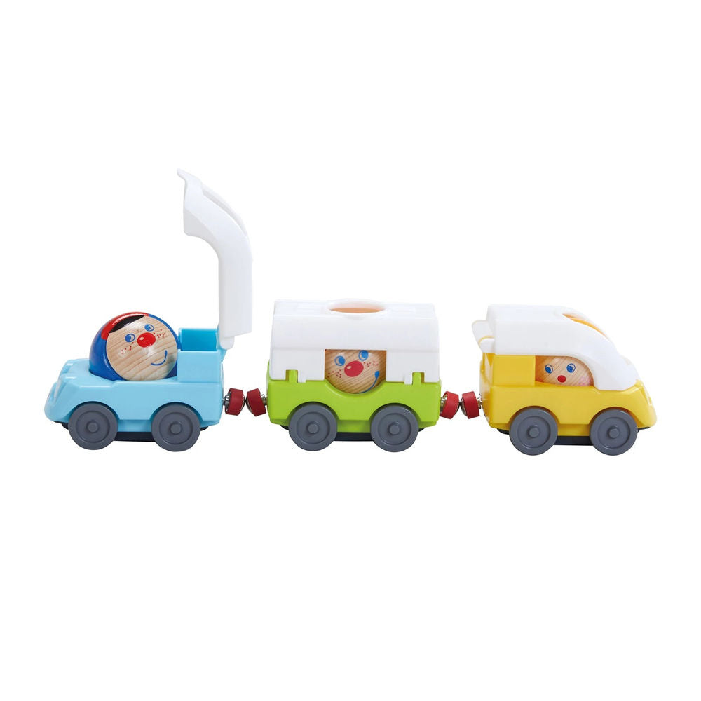 Great addition to all Kullerbü play tracks. Great folding mechanisms: roofs can be opened and balls placed inside. Also perfect for free play. For unlimited Kullerbü driving fun. Railcar and wagon connected by a stable magnetic holder.