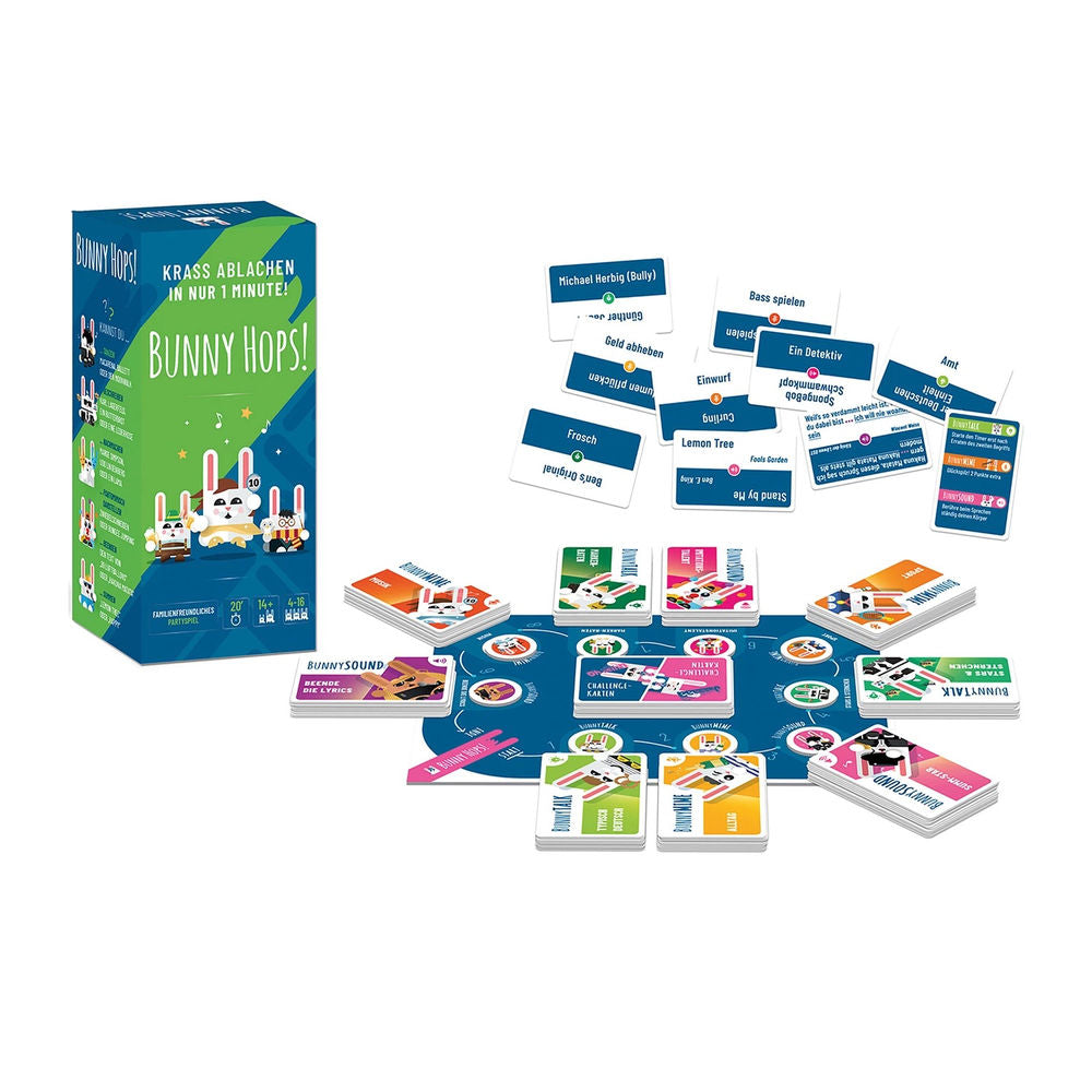Get ready for Bunny Hops!, the family-friendly party game for everyone aged 14 and over! You play in teams and try to guess the most words in one minute. There are 9 topics such as "celebrities", "songs", "brand names" or "sports"! When it's your turn to guess, you hold a card with a word on it to your forehead. Now it's up to your team members: They have to get you to guess the word. Sounds easy? Watch out! Depending on the category, they can't just describe it, but have to imitate animals or people, hum songs or mime the word. But that's not all: You also have to draw challenge cards that make each round special: Maybe you have to pretend to have hiccups, dance at the same time or use only one arm for your gestures! There are over 400 cards with more than 900 words waiting for you in Bunny Hops!