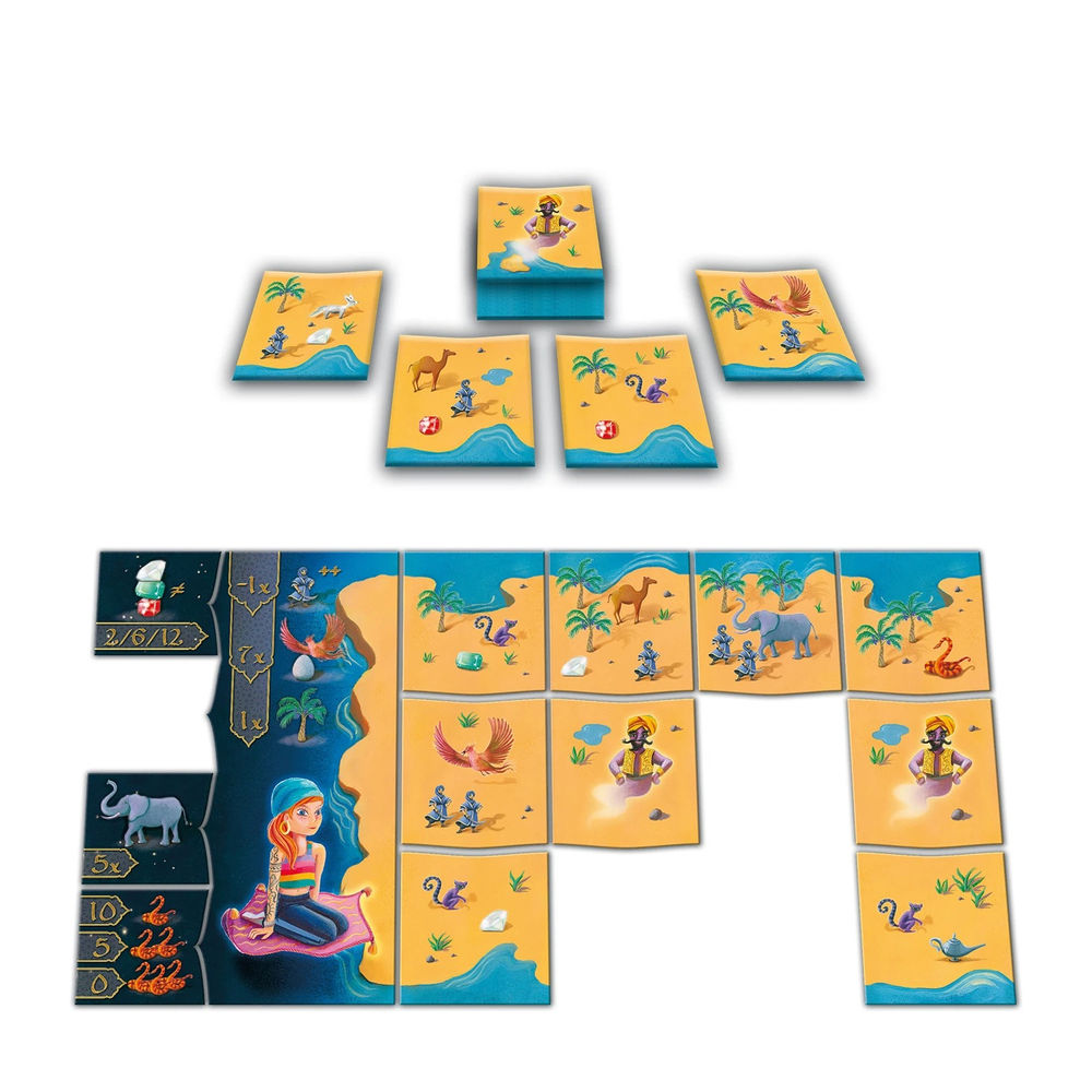Slip into the roles of Sinbad's children and go on a journey of discovery. For many years you have dreamed of the exotic animals, the beautiful gemstones and the magic lamps from the tales of 1001 Nights. Travel through the land as an adventurer, but it is better to keep the most beautiful finds to yourself. After all, each of you wants to report the most wonderful things. Meet the giant bird Rock, see elephants and desert foxes, but watch out for the robbers and snakes! The genies in the bottle are not without risk either, because fulfilling wishes has its price!