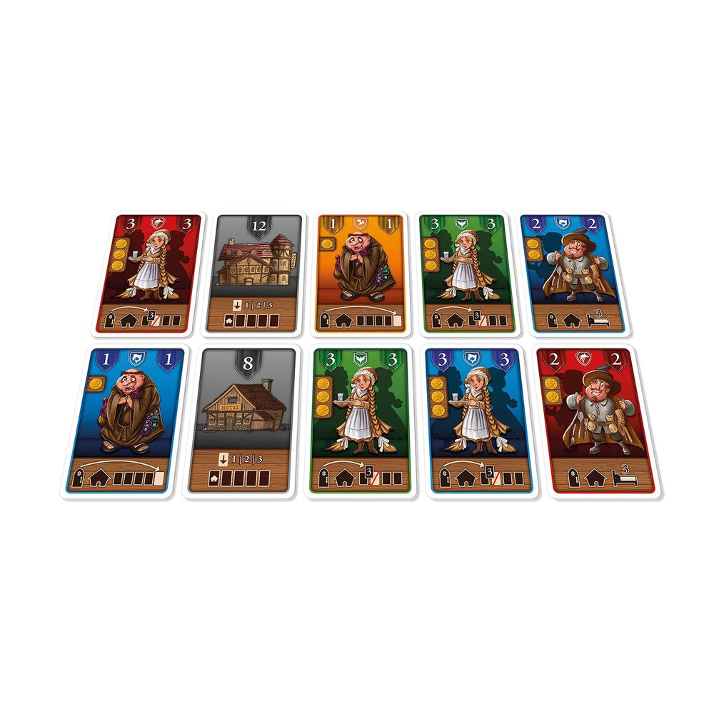 Once upon a time... there was a king who wanted to throw a royal party of the finest for his daughter. Thousands of guests from all over the country were invited - traveling merchants, monks, soldiers and many others flocked to the capital. But oh dear! Because everyone was hoping for last-minute discounts, no one had booked a hotel room in advance. Now the big race for the last available rooms begins! Who can get a place to sleep, who has to stay outside and who might manage to get in through the back door with a nasty trick? In this entertaining game for the whole family, each player tries to place their guest cards in the few hotels and thus collect points. But be careful: each hotel can only accommodate a certain number of guests. You have to guess how many guests the opponents will send into the race for the rooms and what devious plans they will make to get in your way.