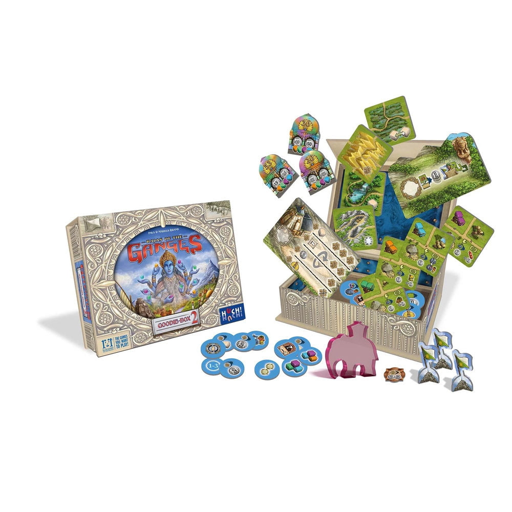 In the Great Mogul's chest you will find various mini-expansions that can be used to enrich the basic game Rajas of the Ganges. These include the Kedarnath expansion published by Bretterwissern in 2019 and the following new modules: Holi - Festival of Colors, The Pink Elephant, The Sacred Cows, The Blessings of Kedarnath with a new back, The Roads of the Mogul Empire, Through Wild Gangestan and the Ganga Module 3 with new river tiles and rules.