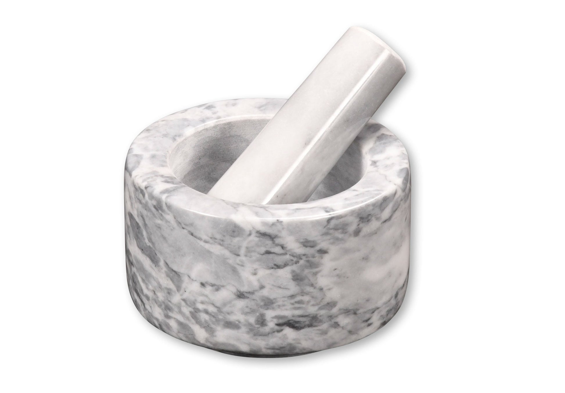 Mortar made of white marble, handy, polished on the outside, ground on the inside.