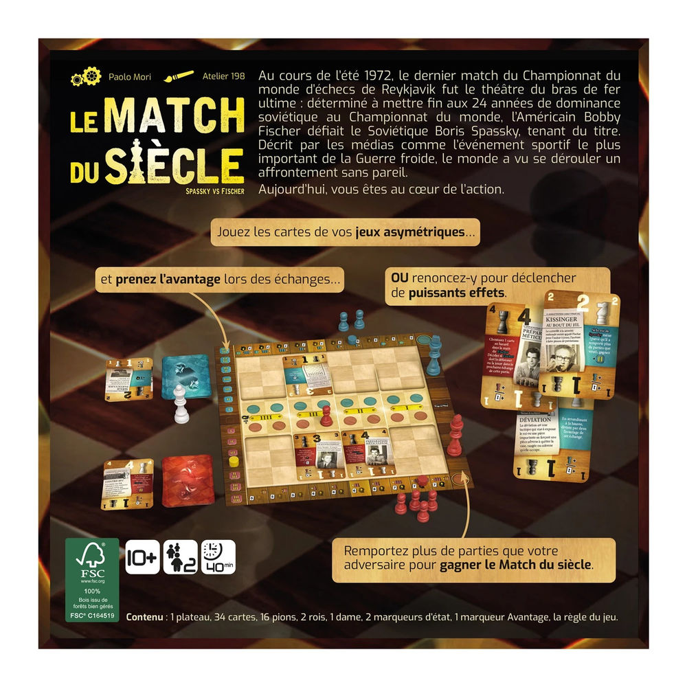 LE MATCH DU SIECLE nous propulse au cœur de la guerre froide lors de la finale mondiale d'échec de 1972, entre Bobby Fischer et Boris Spassky. Tension permanente et choix cornéliens vous attendent dans ce duel au sommet : jouez les cartes de vos jeux asymétriques et prenez l’avantage lors des échanges ou renoncez-y pour déclencher de puissants effets. Remportez plus de parties que votre adversaire pour gagner le Match du siècle.