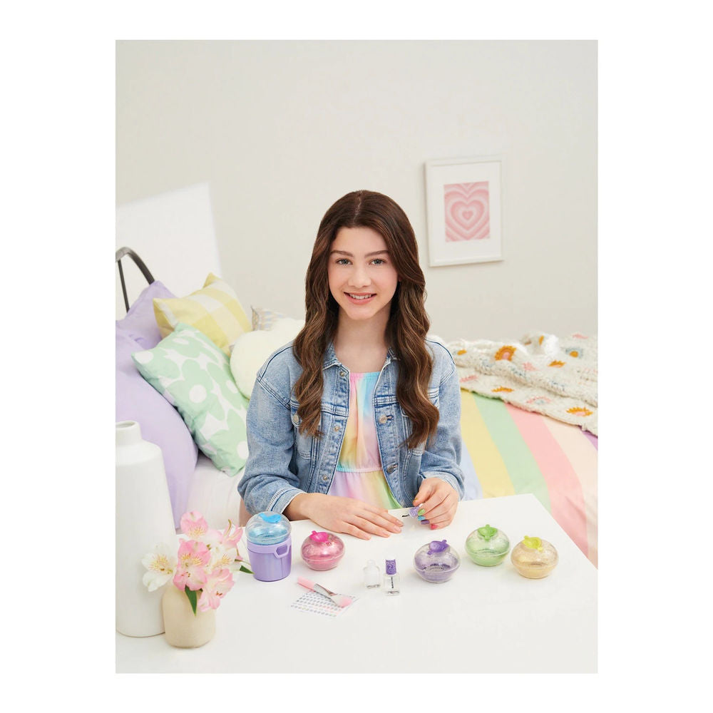 With the Party Nails nail studio, you can easily create glittery nails. Contents: 1 glitter machine, 5 glitter containers, 1 bottle of glitter base coat, 1 bottle of clear nail polish, 1 brush, 1 sheet of nail stickers, 1 instruction manual.