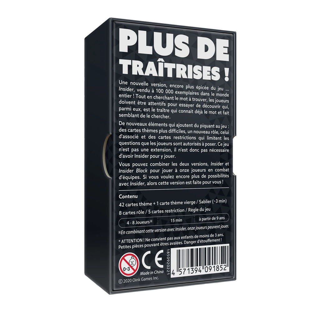 A new, even better version of the Insider game, sold in 100,000 copies around the world! All in looking for the word to find, players have to be careful to try to find out here, especially if it is the traitor who already knows the word and makes the search seem obvious. New elements that add spice to the game: more difficult-to-understand cards, a new role model, and restriction cards that limit the questions that players are allowed to ask. This game is not an extension, so you don't need Insider to play. You can combine the 2 versions, Insider and Insider Black, to play with 11 players in team combat. If you still want more options with Insider, then this version is made for you!