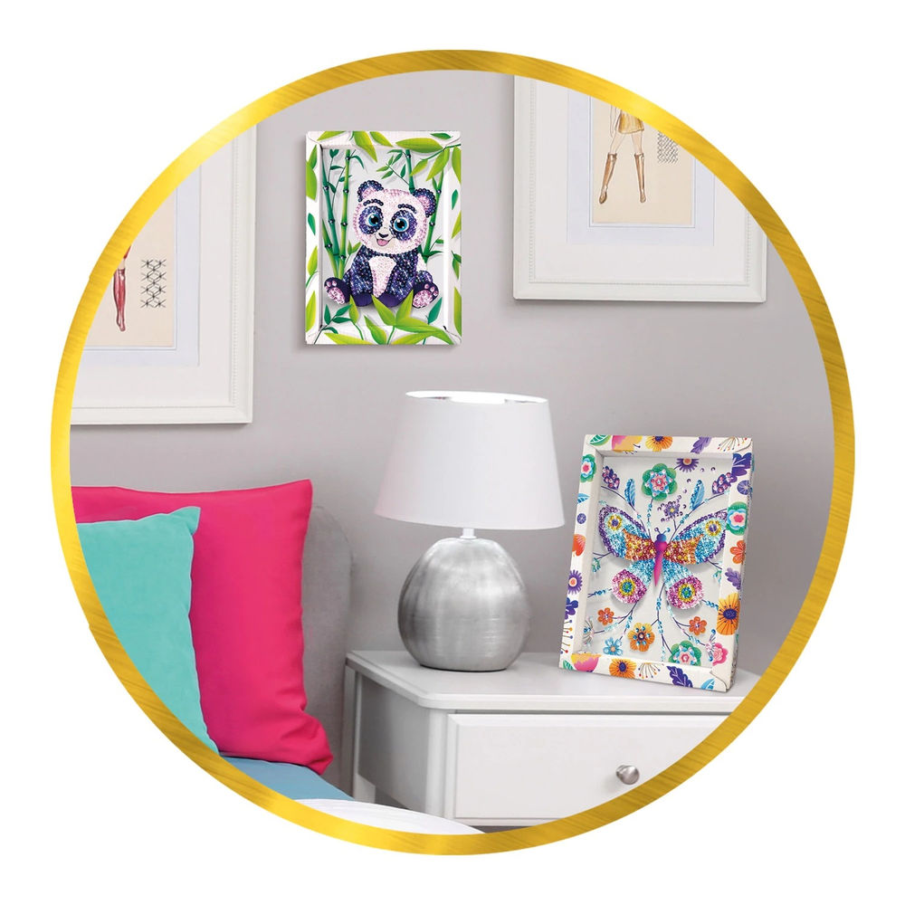 Mit Pailletten ein schönes Bild kreieren. Die Abbildung eines Pandas liegt auf einer Styroporplatte, die als Basis für die Befestigung dient. Es sind kleine Nadeln enthalten. Inkl. Setzkasten als Ablage für die verschiedenen Pailletten. Dank dem Rahmen lässt sich das fertige Bild problemlos aufstellen und an die Wand hängen.