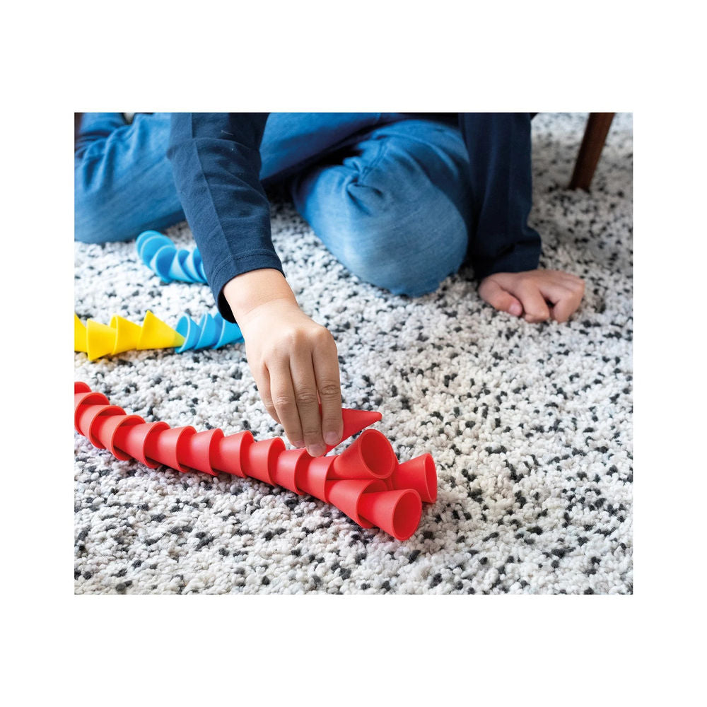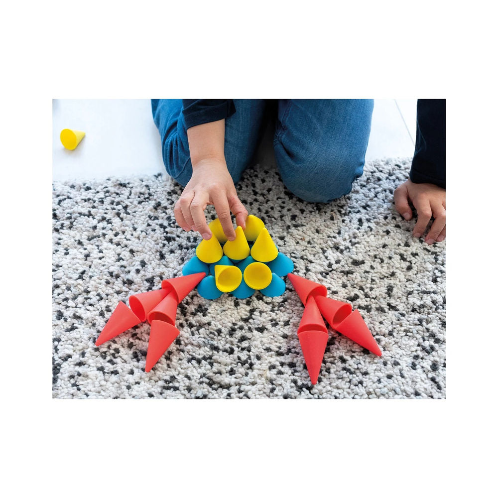 Piks ist ein Konstruktionsspielzeug, dass die motorischen Fähigkeiten der Kinder sowie die Kreativität fördern soll. Inhalt: 48 Kegel aus Silikon (3 verschiedene Grössen, blau, rot, gelb) und Anleitungsheft (mit Beispielen)