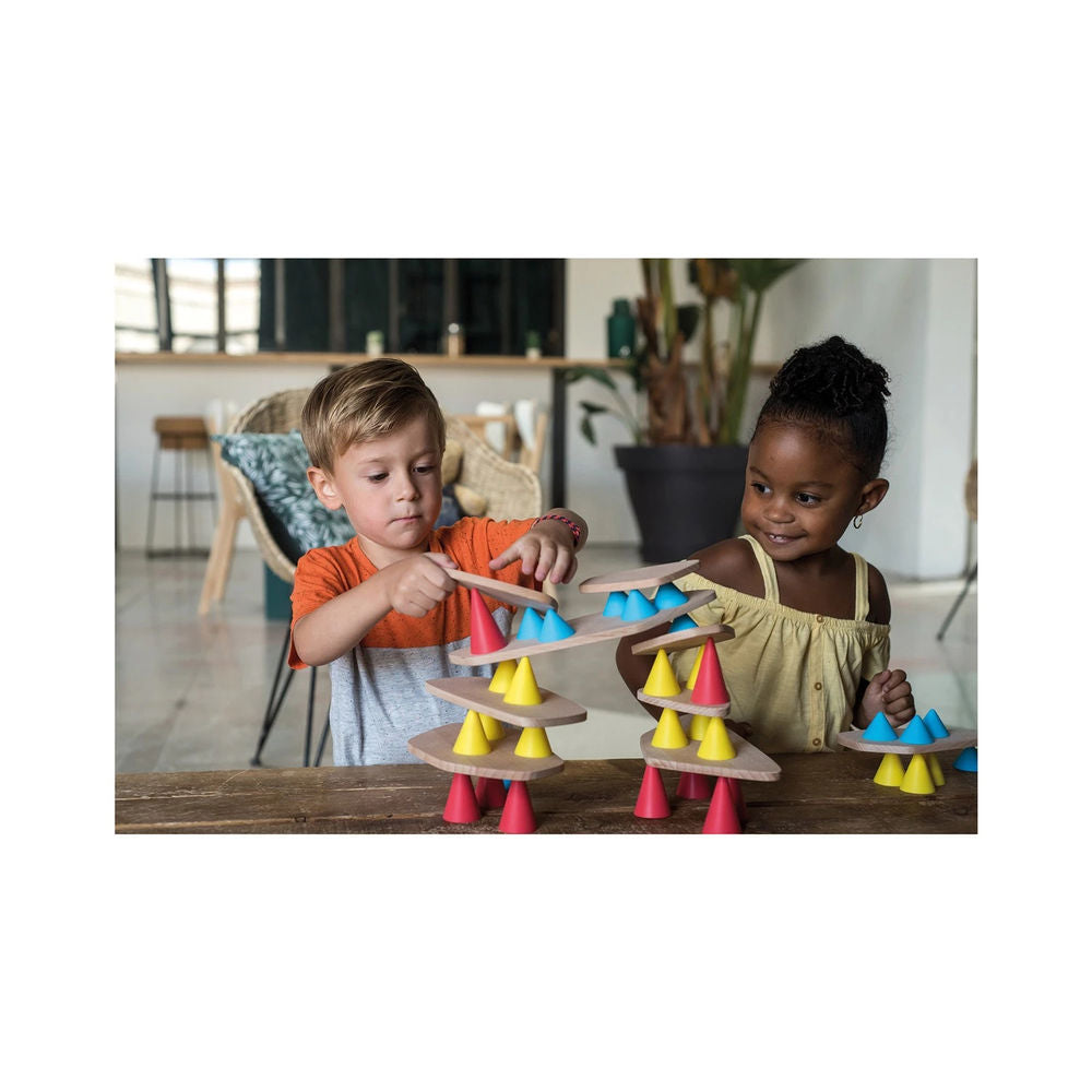 Piks ist ein Konstruktionsspielzeug, dass die motorischen Fähigkeiten der Kinder sowie die Kreativität fördern soll. Inhalt: 33 Kegel aus Silikon (3 verschiedene Grössen, blau, rot, gelb) sowie 11 massive Holzplatten und Anleitungsheft (mit Beispielen)
