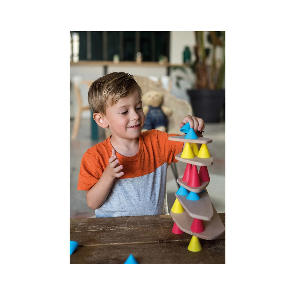 Piks ist ein Konstruktionsspielzeug, dass die motorischen Fähigkeiten der Kinder sowie die Kreativität fördern soll. Inhalt: 18 Kegel aus Silikon (3 verschiedene Grössen, blau, rot, gelb) sowie 6 massive Holzplatten und Anleitungsheft (mit Beispielen)