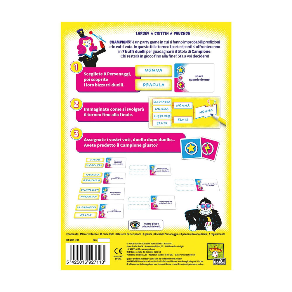 Champions! It's a party game in which improbable predictions are made and in which votes are cast. In this great tournament the participants will face 7 buffalo duels to win the title of Champion. Who will stay in the game until the end? Make up your mind!