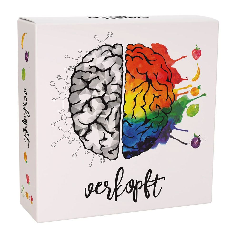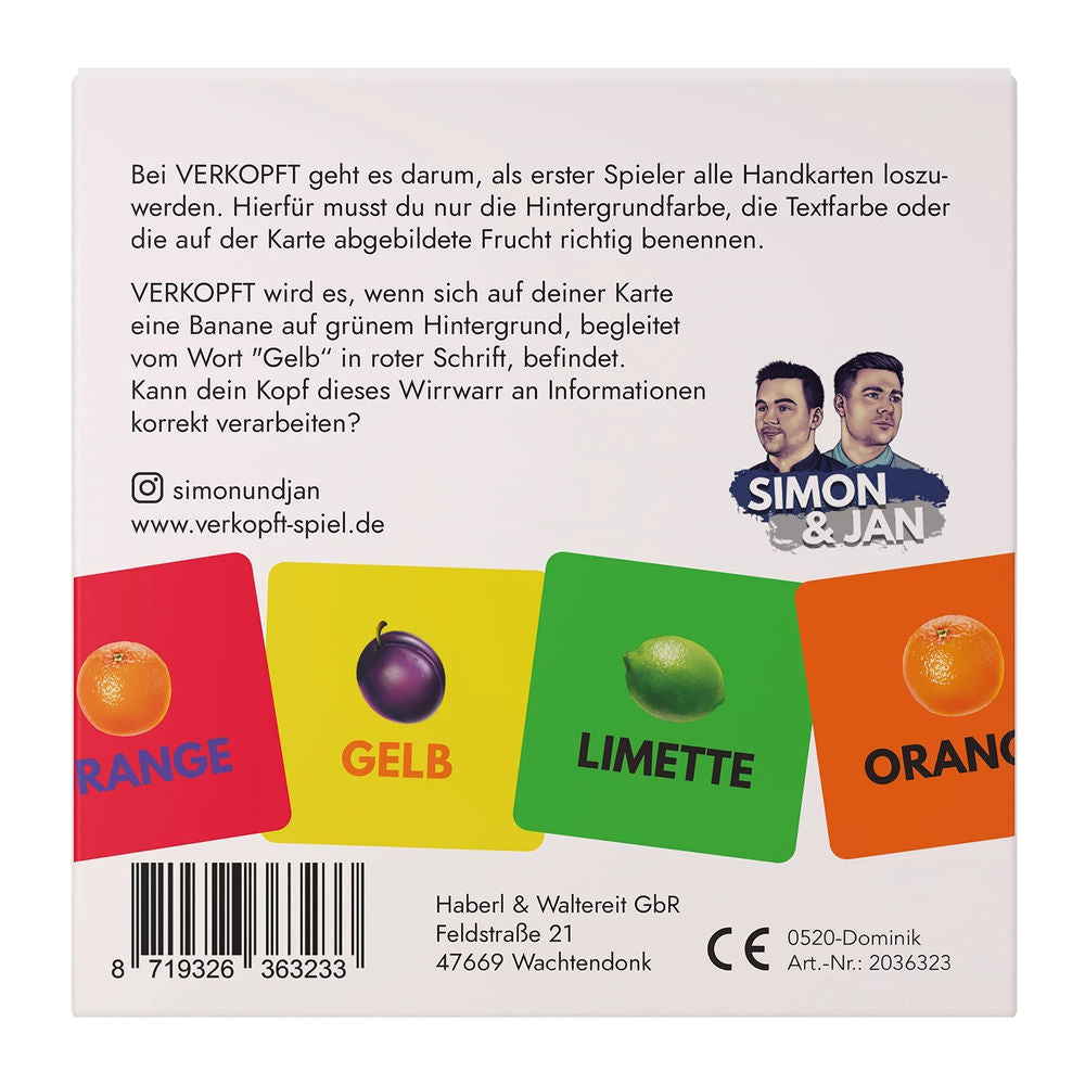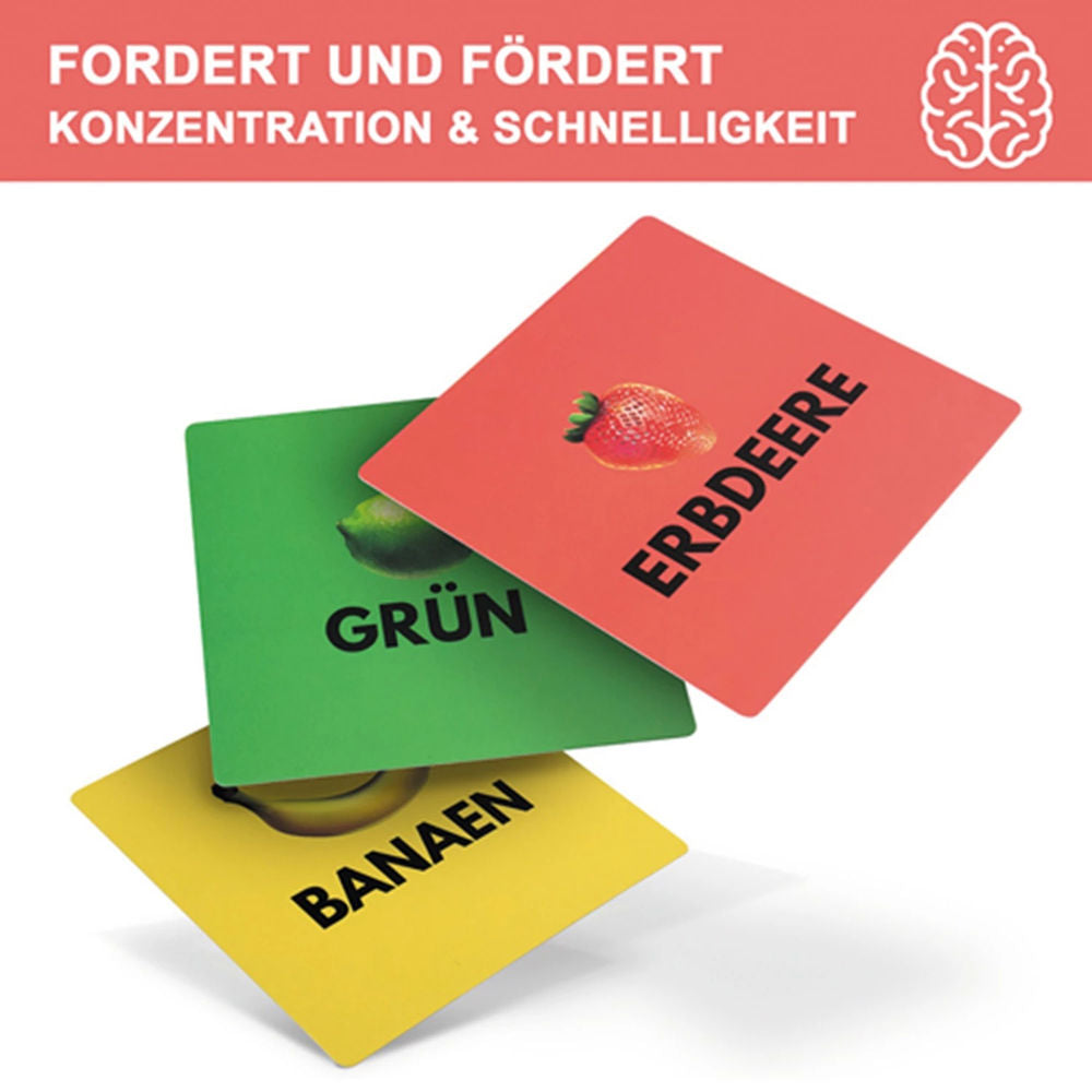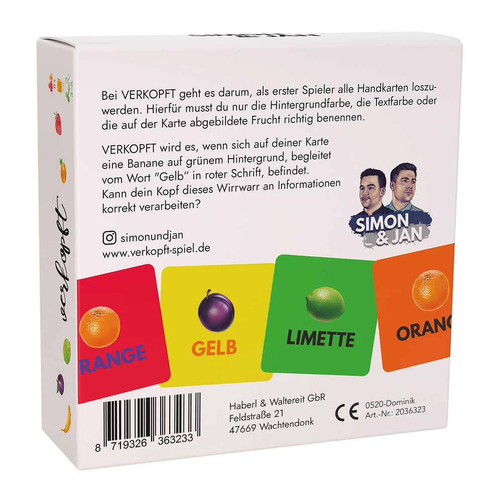 Verkopft is a card game in which the aim is to be the first player to get rid of all the cards in your hand. To do this, you just have to correctly name the background color, the text color or the fruit shown on the card. Sounds doable, right? Now imagine that the card has a banana on a green background, accompanied by the word "purple" in red. You have 3 seconds to process this confusing jumble of information and give the correct answer. Have fun!