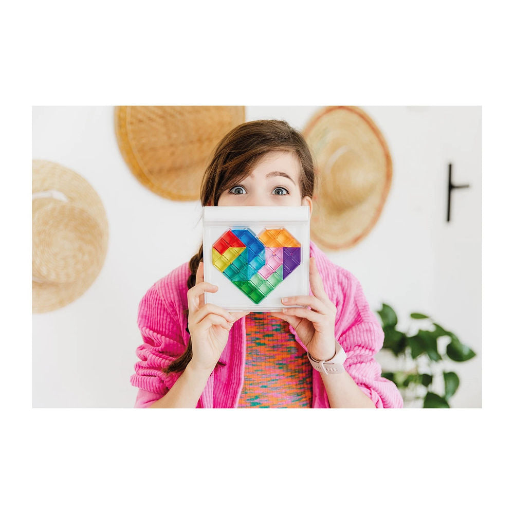 A declaration of love to your grey cells! Can you place all the colorful gems on the game board? This travel game has a double-sided game board and offers 120 challenges for true love!