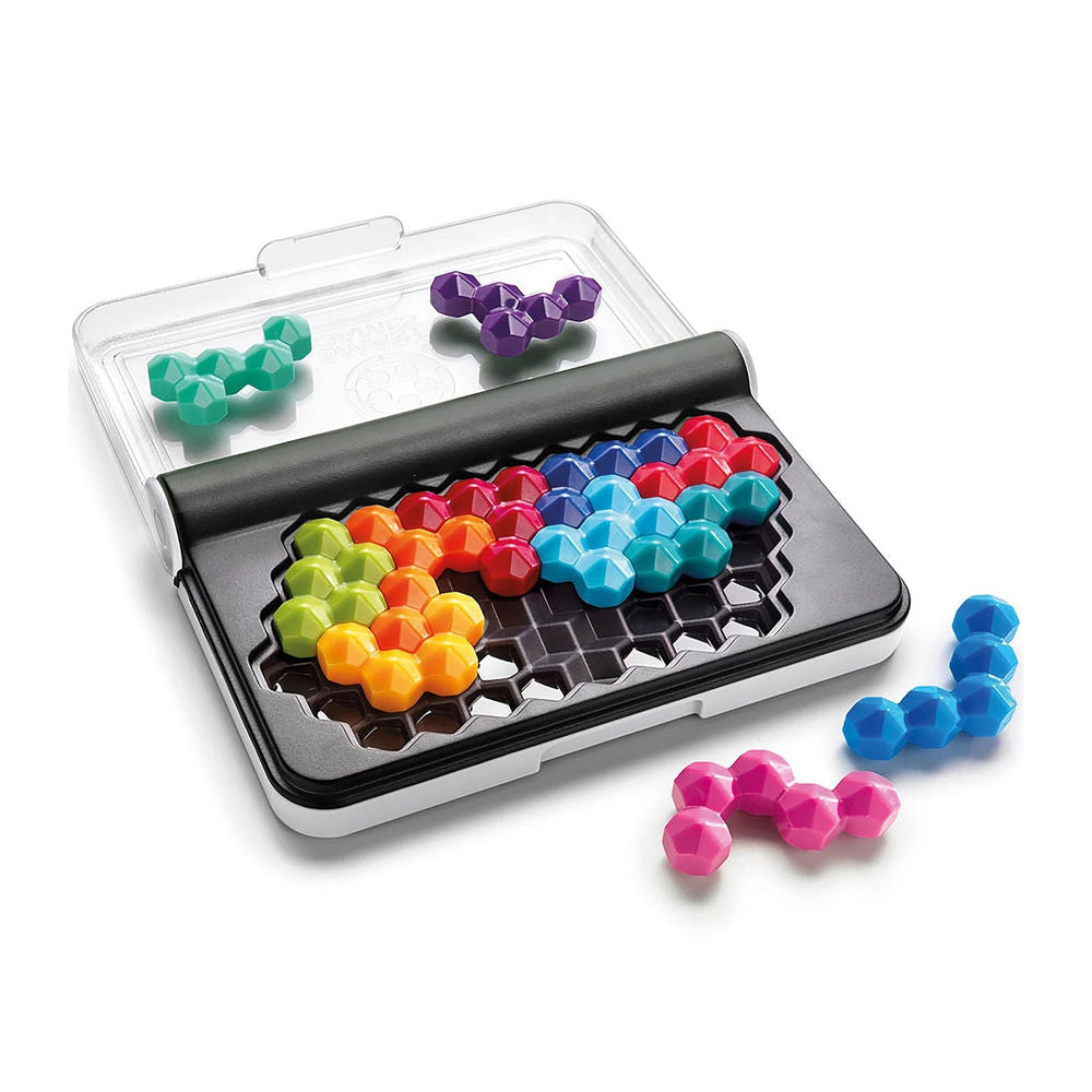 On the top of the board there is a grid for 2D challenges and a grid for 3D pyramid challenges, while on the bottom of the board there are colorful butterflies to design on the 2D challenge grid. All in compact IQ format!