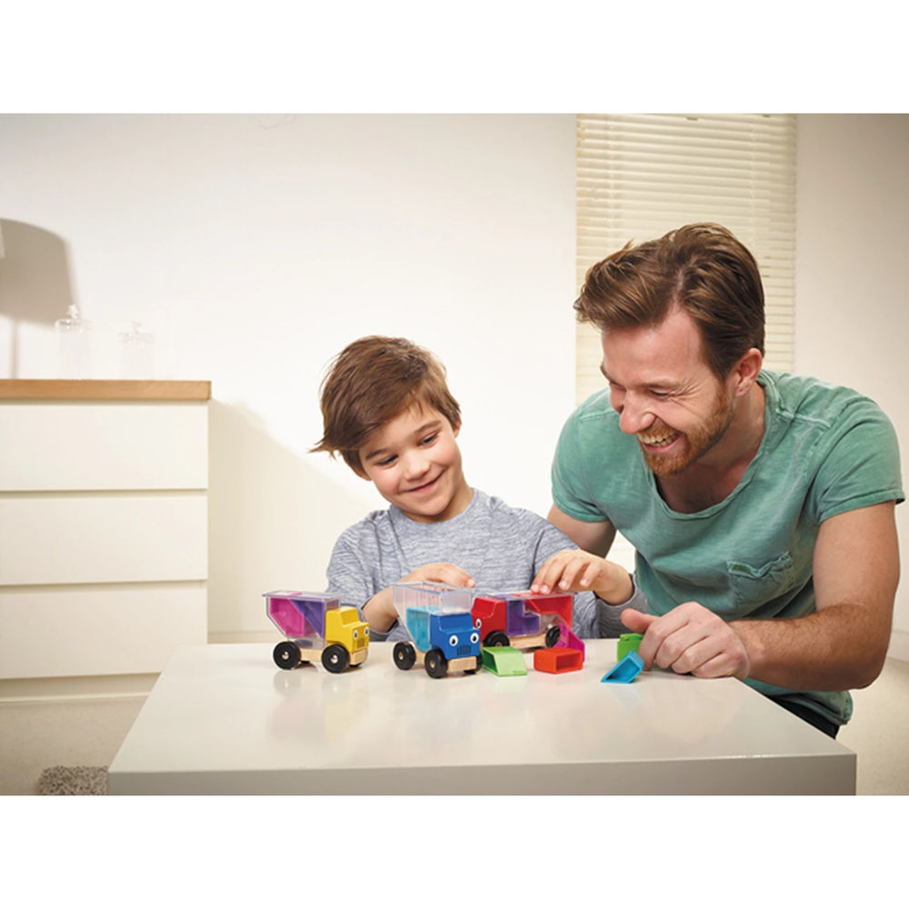 Choose a task. Choose the truck and the pieces as shown on the task card. Some tasks require more than one truck. Sort out the trucks and pieces that are not needed and put them away.