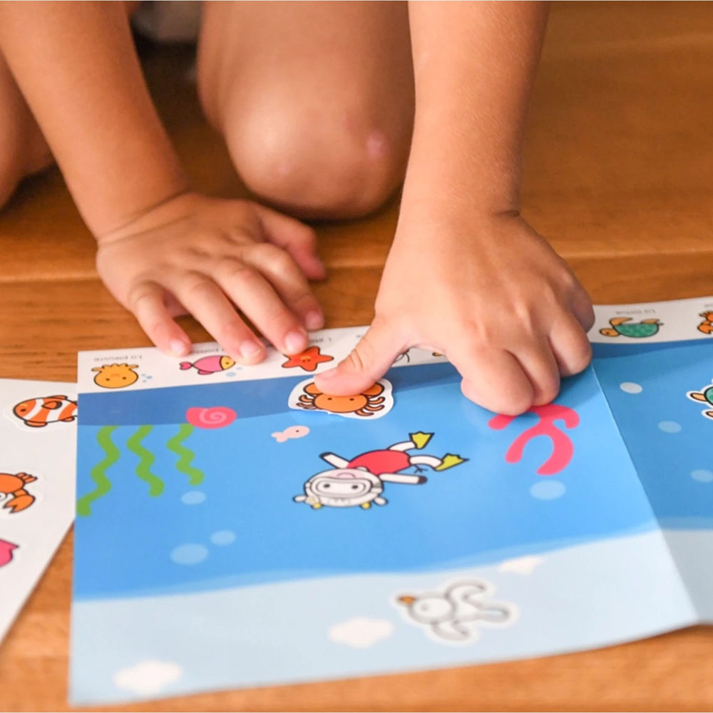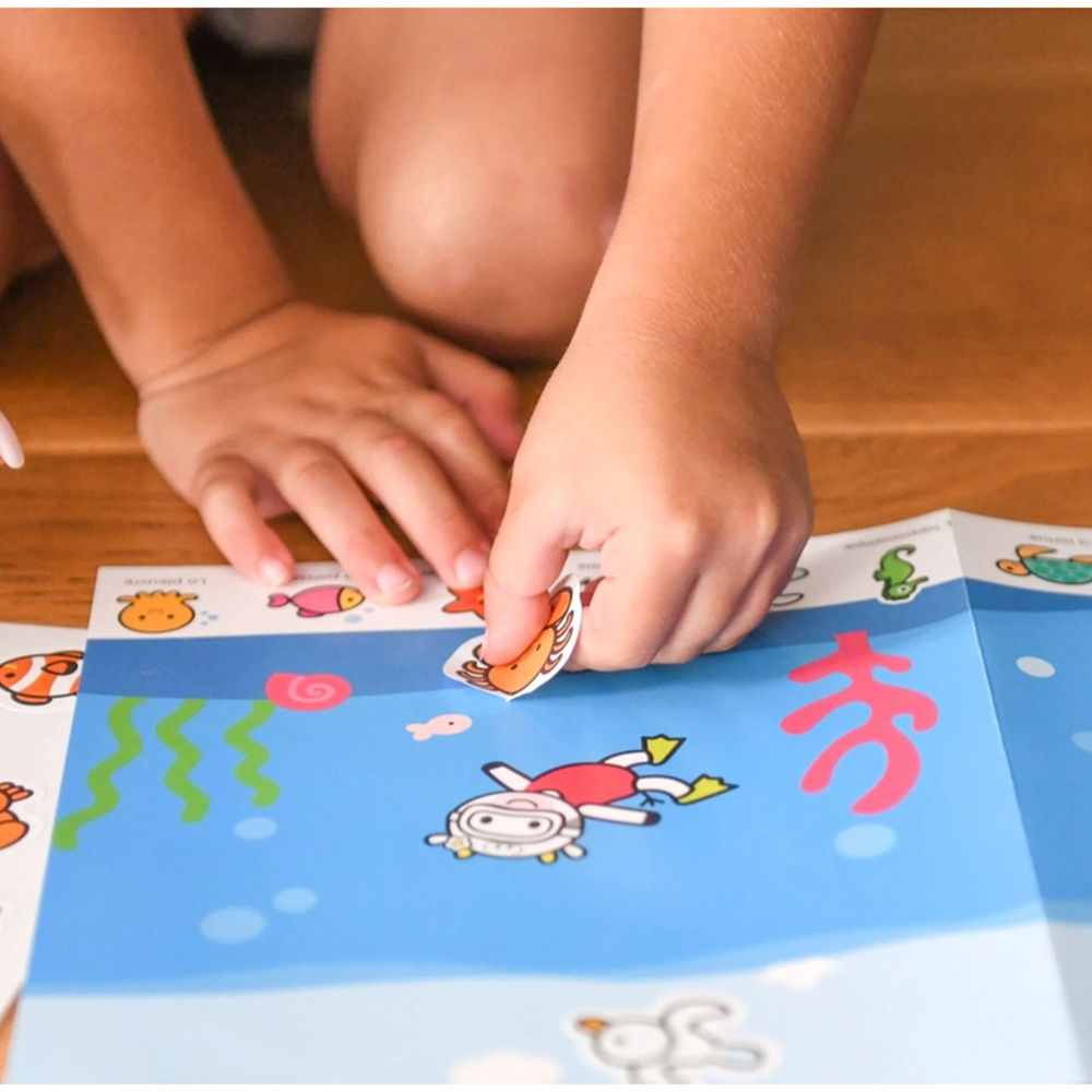Mit dieser Sticker Box entdecken die Kinder die Tiere. Die perfekte Aktivität für Kleinkinder, dank 100 extragrossen Stickers – besonders leicht zu greifen. 6 Posterthemen (Meerestiere, Waldtiere, Tiere auf dem Land, Tiere auf dem Eis, Tiere der Welt und Tierrufe). Es fördert die Feinmotorik und die Hand-Augen-Koordination. Die Sticker Box ist auch geeignet für unterwegs.