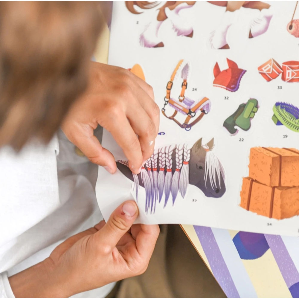 Mit diesem Poster, das mit wiederverwendbaren Stickern ergänzt werden kann, begeistern sich die Kinder für das Thema Pferde: Sie lernen das Vokabular für die Anatomie der Pferde, das Futter und weitere Themen rund ums Thema: das Reiten. Die Sticker werden auf das riesige Poster geklebt. Daraus entsteht ein sehr schönes Poster für das Zimmer. Es fördert die Feinmotorik, Konzentration und Kreativität. Inhalt: 1x Poster, 48 Stickers
