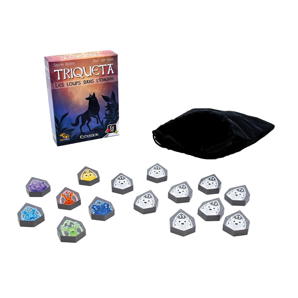 Avec cette extension, des loups amicaux mais timides, s’invitent dans Triqueta. Ils restent dans l’ombre jusqu’à la fin de la partie et valent beaucoup de points lorsqu’ils forment une Triqueta. Serez-vous assez audacieux pour partir à leur recherche? Inclut une fantastique variante pour 2 joueurs!