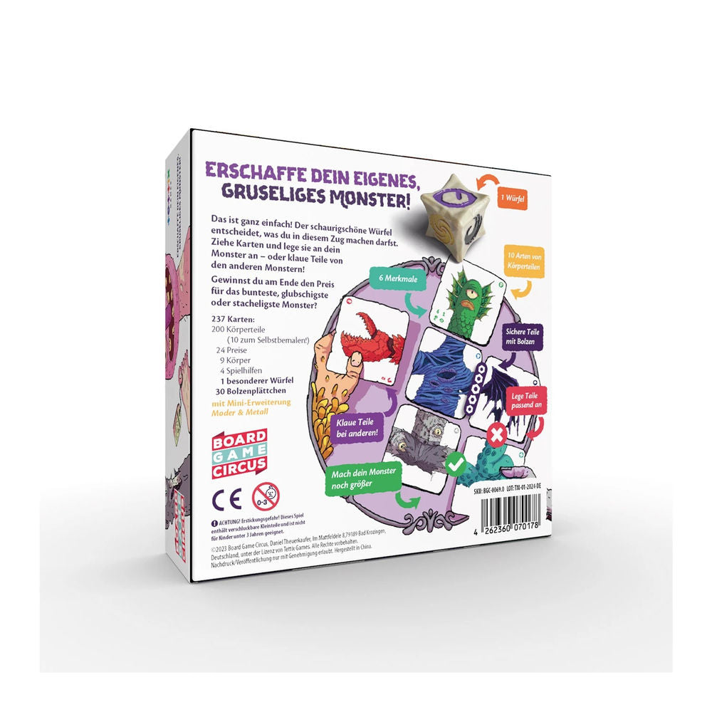 Baue dir dein eigenes, gruseliges Monster! Heute findet der große Monstertüftelwettbewerb statt. Es geht es darum, das furchterregendste, ekligste, schrecklichste, gruseligste, scheußlichste und fieseste Monster zu bauen. Ihr seid dabei und wollt mit eurem Monster gewinnen! Dazu müsst ihr bloß die Monsterjury überzeugen … Baue dir aus einer großen Auswahl an Körperteilen dein eigenes, gruseliges Monster. Das ist ganz einfach! Der schaurigschöne Würfel entscheidet, was du in diesem Zug machen darfst. Ziehe Karten und lege sie an dein Monster an – oder klaue Teile von den anderen Monstern! Sichere deine Körperteile mit Bolzen, sodass sie nicht geklaut werden können. Baue bunte Monster mit vielen Zähnen, Ohren, Flügeln und vielen weiteren Merkmalen und überzeuge die Monsterjury von deiner Schöpfung. Tüftelmonster ist ein einfaches und lustiges Spiel für jedes Alter. Ob gezogen oder geklaut, die richtige Kombination an Körperteilen bringt die Punkte, um die Monsterjury zu überzeugen. Aber am Ende ist jedes Monster eine einzigartige Schöpfung. Gewinnst du am Ende den Preis für das bunteste, glubschigste oder stachligste Monster?