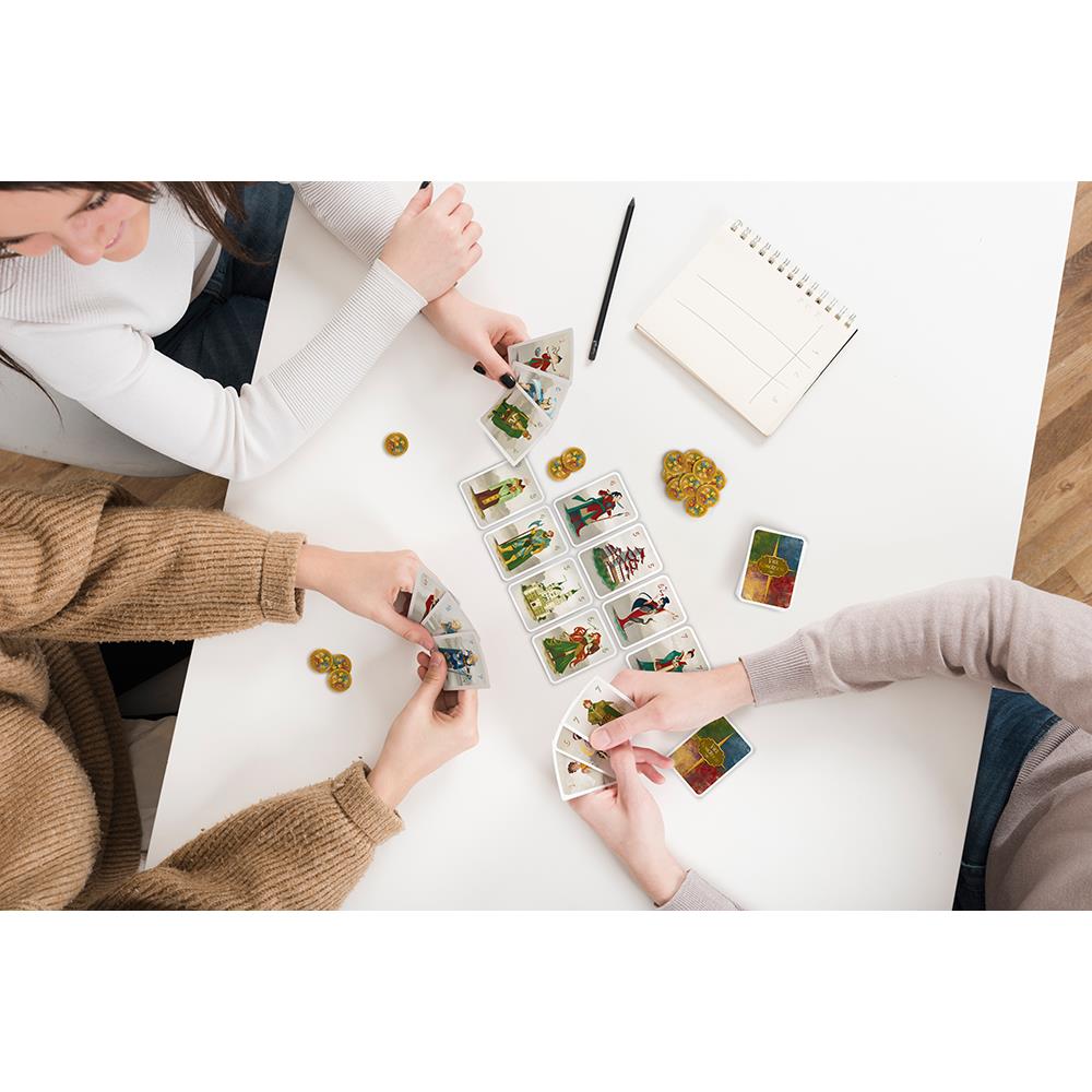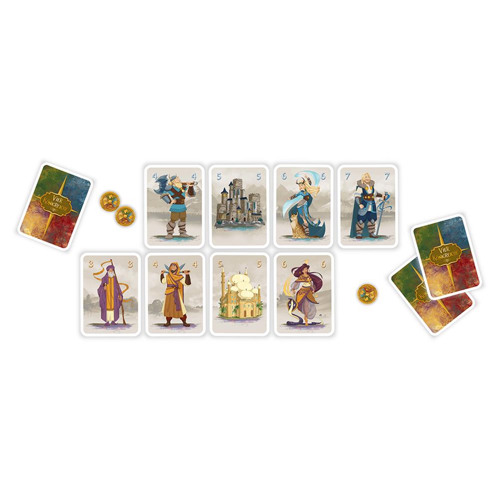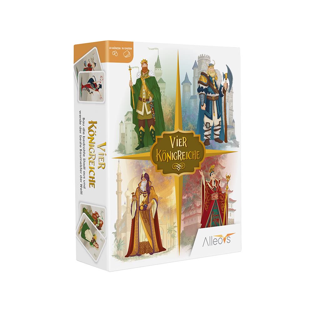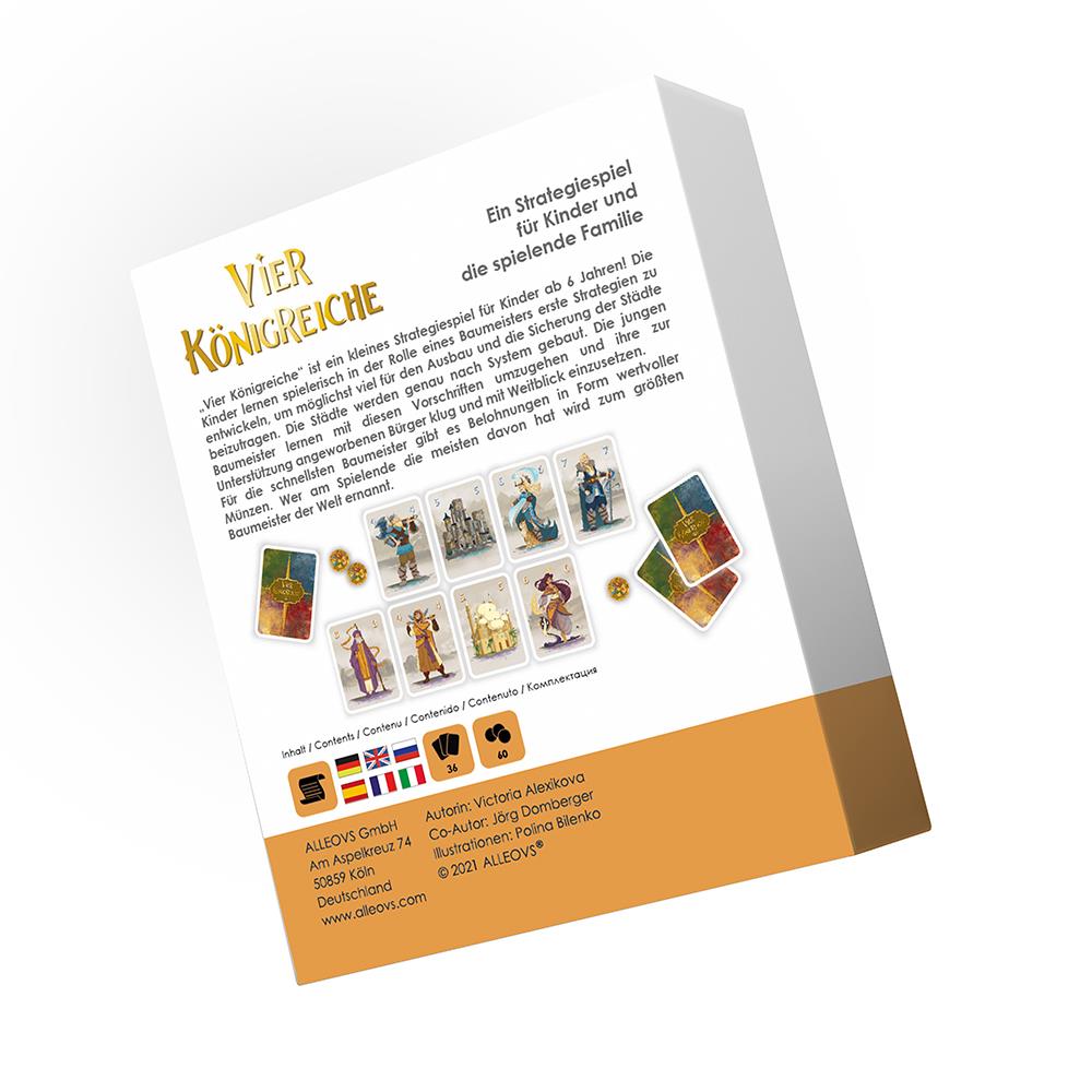 « Quatre Royaumes » est un petit jeu de stratégie pour les enfants à partir de 6 ans ! Les enfants apprennent de manière ludique à développer des premières stratégies dans le rôle d'un maître d'œuvre afin de contribuer autant que possible à l'expansion et à la sécurité des villes. Les villes sont construites exactement selon le système. Les jeunes bâtisseurs apprennent à composer avec ces réglementations et à utiliser les citoyens qu'ils ont recrutés pour les soutenir avec sagesse et clairvoyance. Il existe des récompenses sous forme de pièces de valeur pour les constructeurs les plus rapides. Celui qui en possède le plus à la fin du jeu est désigné le plus grand bâtisseur du monde.