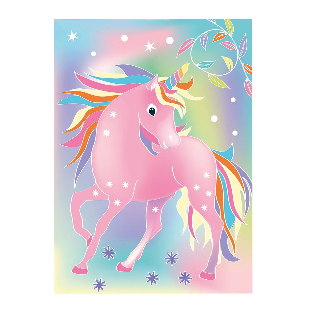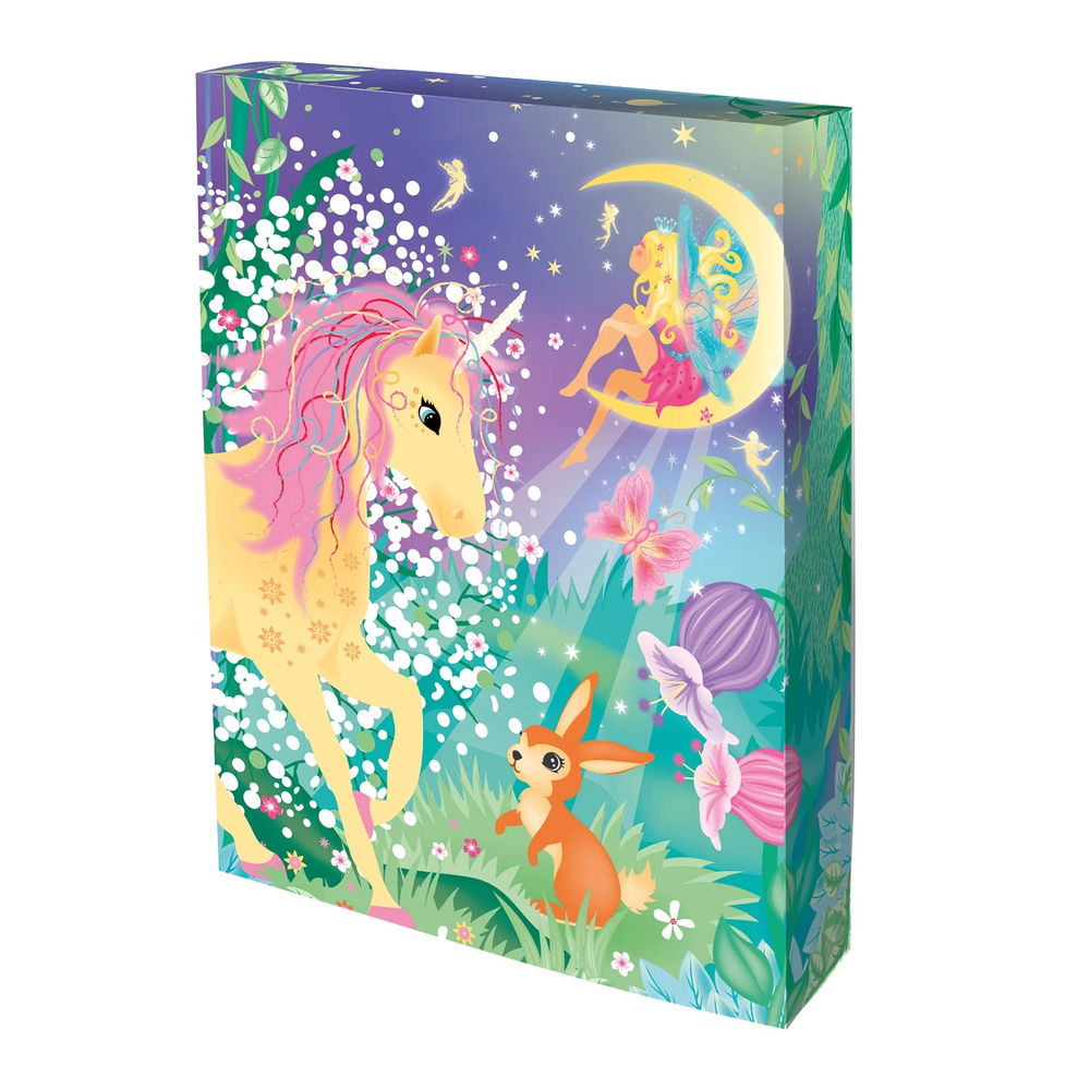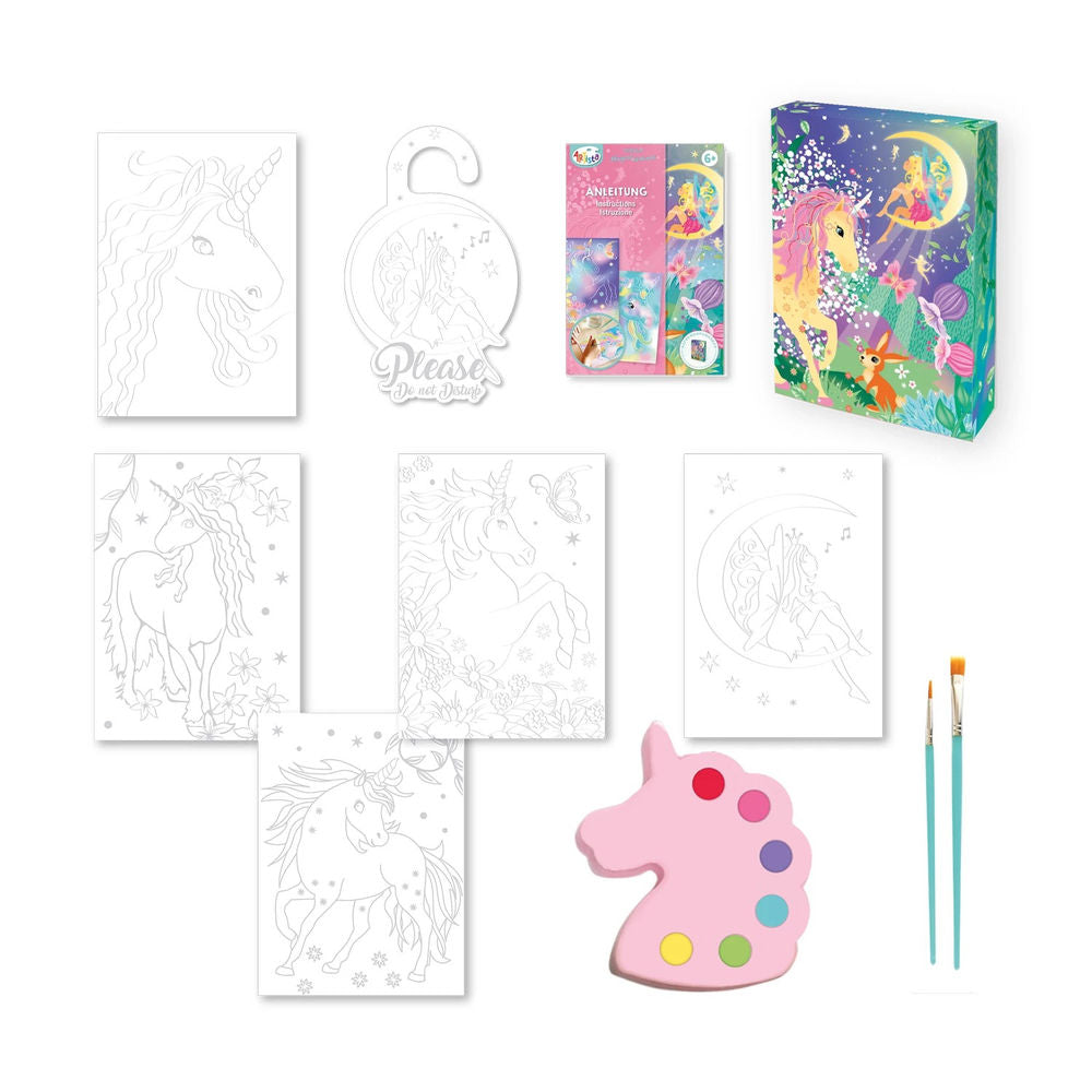 Ensemble de peinture magique permettant aux enfants de créer leur première aquarelle. Grâce aux lignes auxiliaires magiques sur les magnifiques motifs de fées et de licornes, les petits artistes peuvent créer n'importe quelle image sans effort. La palette de couleurs en forme de licorne complète l'ensemble. Dans une jolie boîte de rangement. Contenu : 5 gabarits de coloriage et 1 accroche-porte avec guides magiques, 2 pinceaux, 1 palette de couleurs licorne de 6 couleurs.