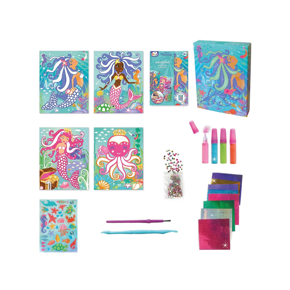 Créez facilement de belles images en utilisant des feuilles de transfert colorées et de la poudre scintillante. Décollez les parties souhaitées du film adhésif, appuyez sur le film ou saupoudrez-le de paillettes. Dans une jolie boîte de rangement. Contenu : 4 tubes de poudre de paillettes, 1 planche d'autocollants, 1 pinceau, 1 stylo en plastique, 8 feuilles métalliques, 4 gabarits pour décorer, 1 sachet de strass, 1 notice avec illustrations.