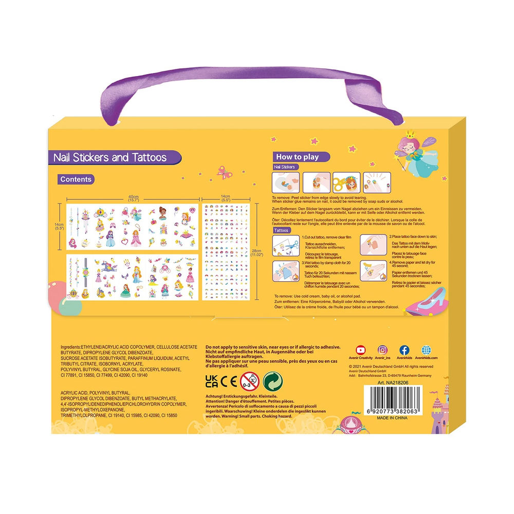 Comprend deux feuilles de tatouages temporaires et une feuille d'autocollants pour ongles sur le thème des princesses.