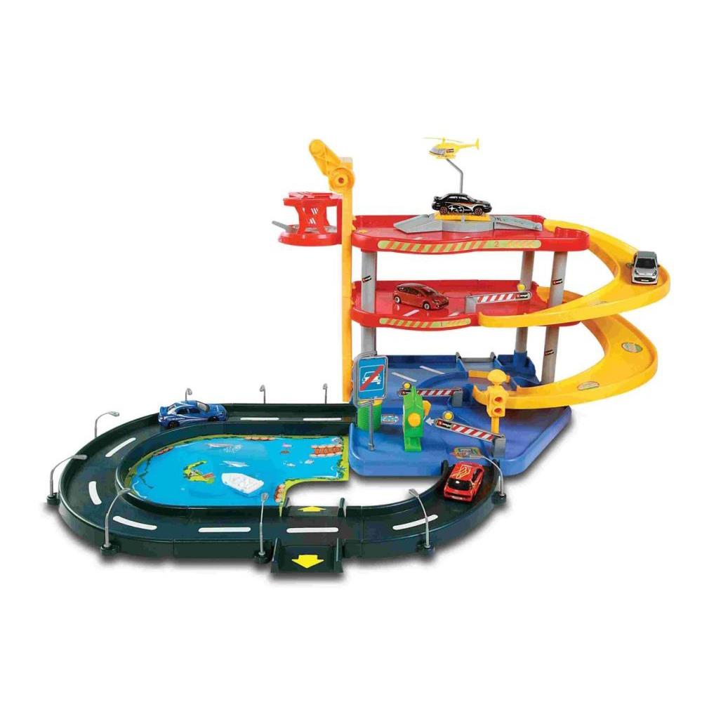 Magnifique garage de jeu de Bburago comprenant deux modèles réduits de voitures en zinc moulé à l'échelle 1:43. Le parking se compose de trois étages avec deux parkings, un ascenseur pour voitures, une rue, des barrières, un lave-auto et une rampe.