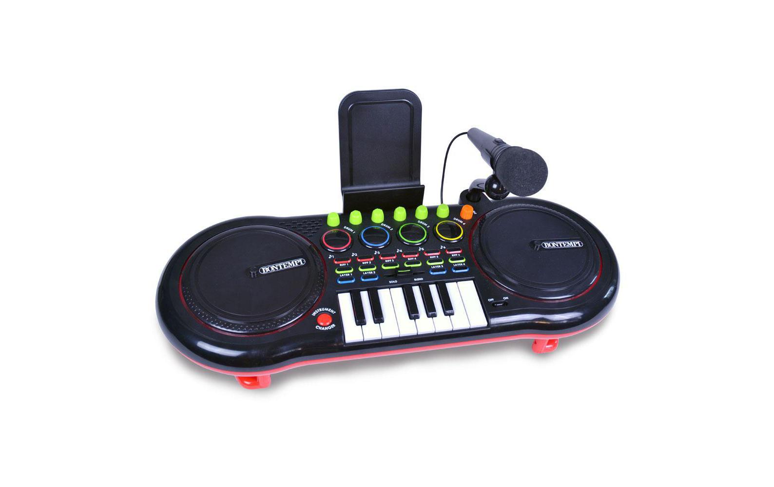 Table de mixage DJ Bontempi avec 2 scratch pads et effets de lumière. 5 effets vocaux, 6 phrases musicales (riffs), 7 effets sonores et bien plus encore. Nécessite 4 piles AA (non incluses).