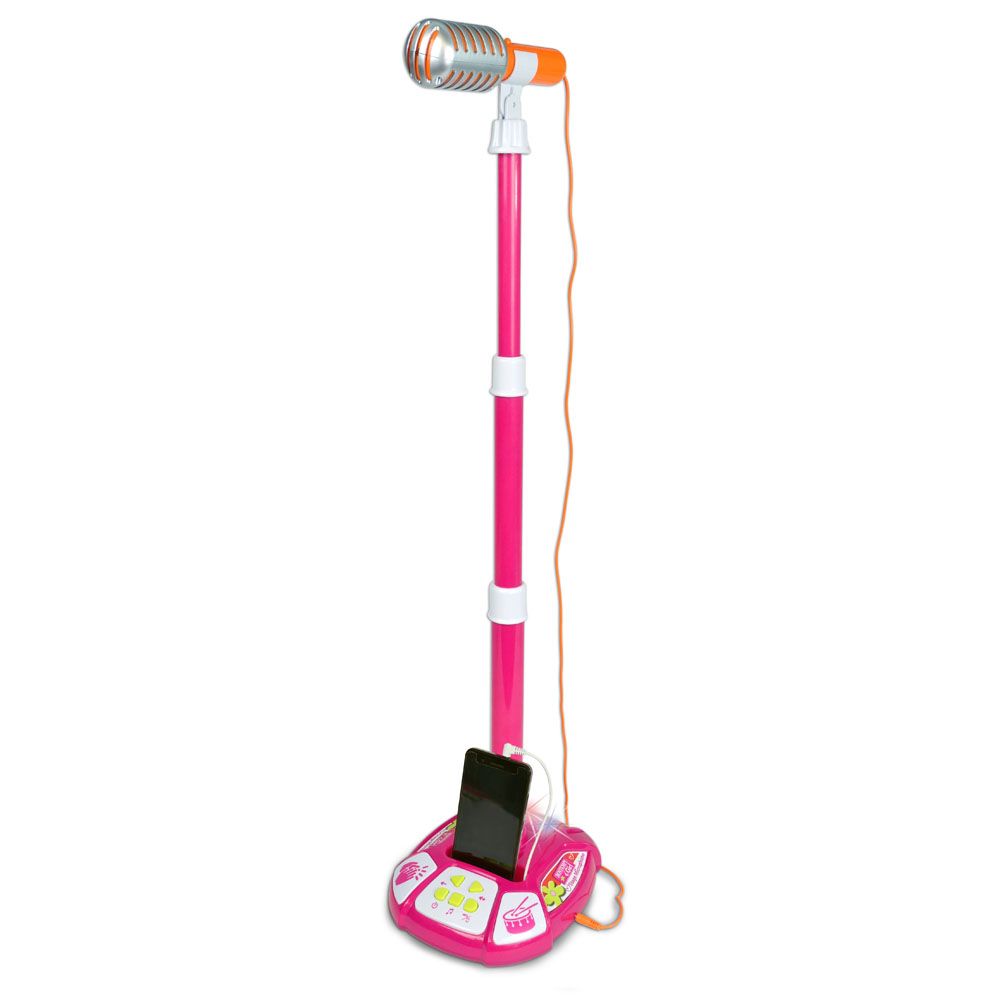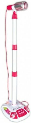 Microphone avec pied et connexion MP3. Le micro dispose de 5 rythmes de batterie, d'effets sonores et de 12 morceaux de démonstration.