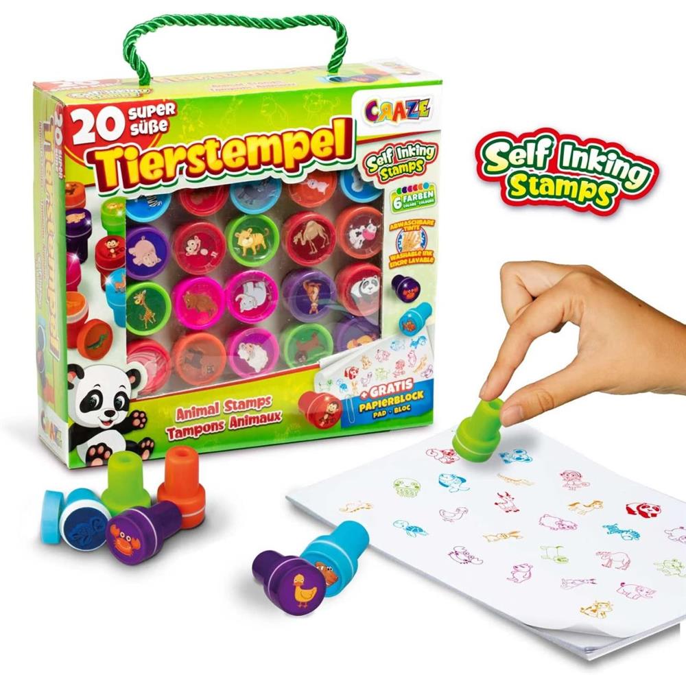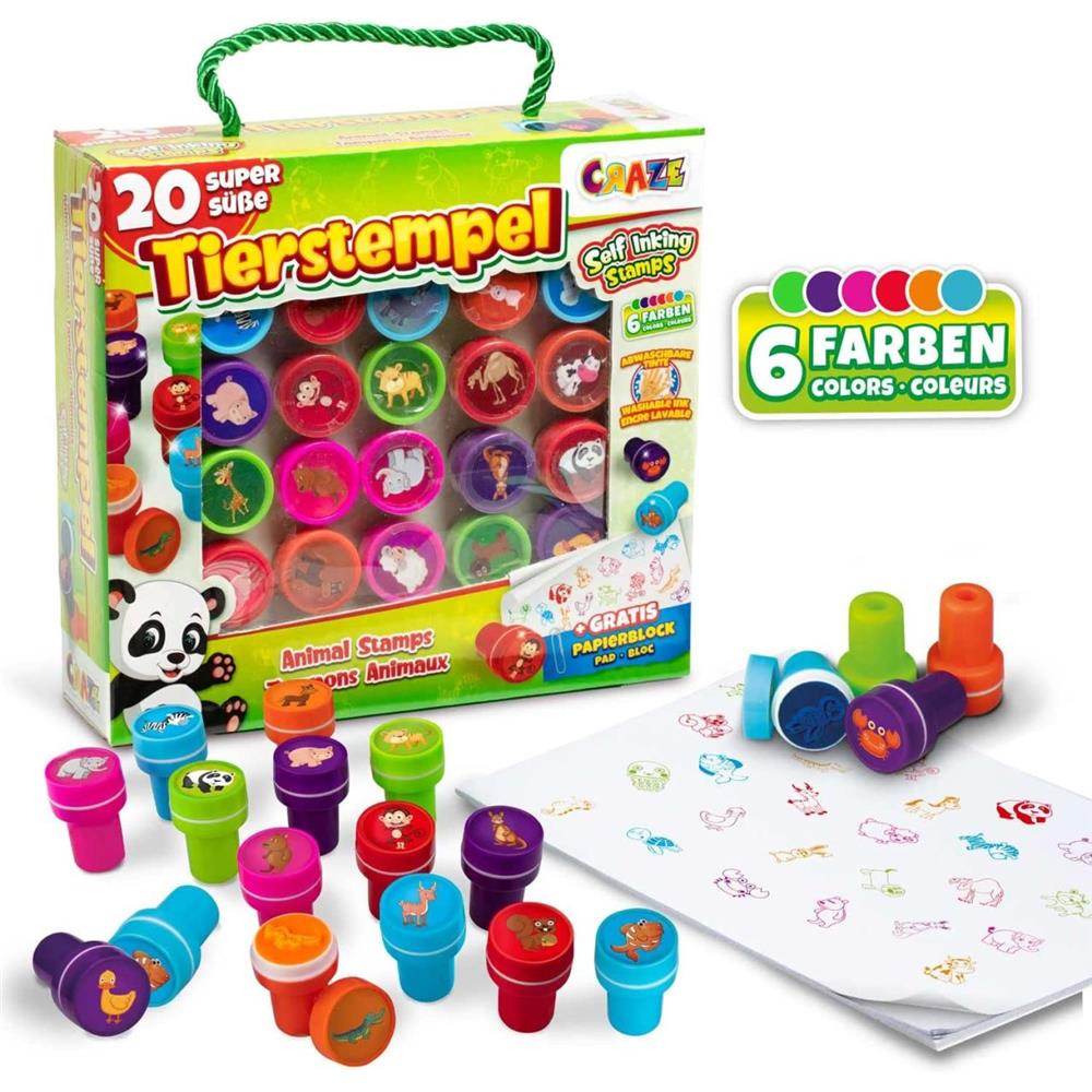 Das Stempelset Kinder beinhaltet 20 Stempelkissen mit Tiermotiven in 6 verschieden Farben und einen Block zum Stempeln. Die Stempelfarbe ist abwaschbar. Mit diesen collen 20 selbstfärbenden Stempeln in 6 unterschiedlichen Farben kann man so richtig kreati
