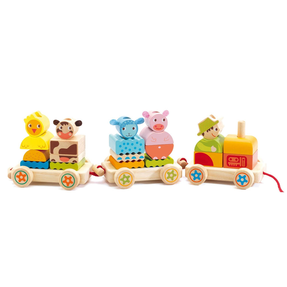 Un beau train en bois composé d'une locomotive, de deux wagons et de nombreux blocs et figurines colorés.