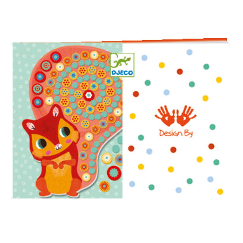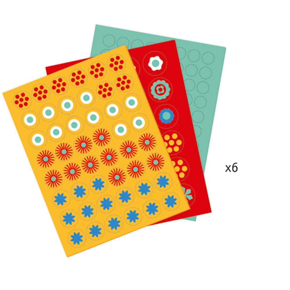 Une introduction à la création d'une mosaïque avec des autocollants. L'enfant joue avec les formes, les matières et les couleurs et colle des points colorés et décorés pour créer 3 tableaux adorables.
